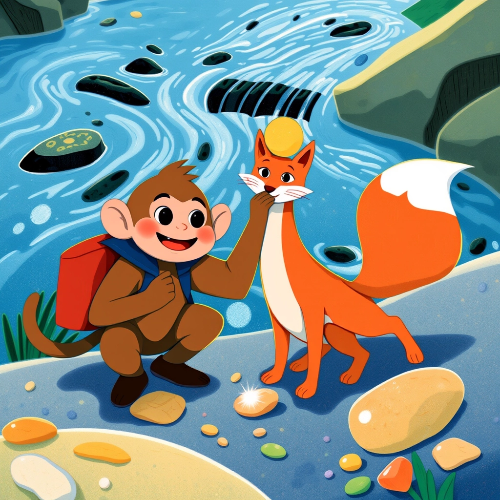 [Milo](KF463JNG) set off to find his friends. First, he met [Flynn](944MZPCJ), the clever orange fox, who was busy counting shiny pebbles by the sparkling river.