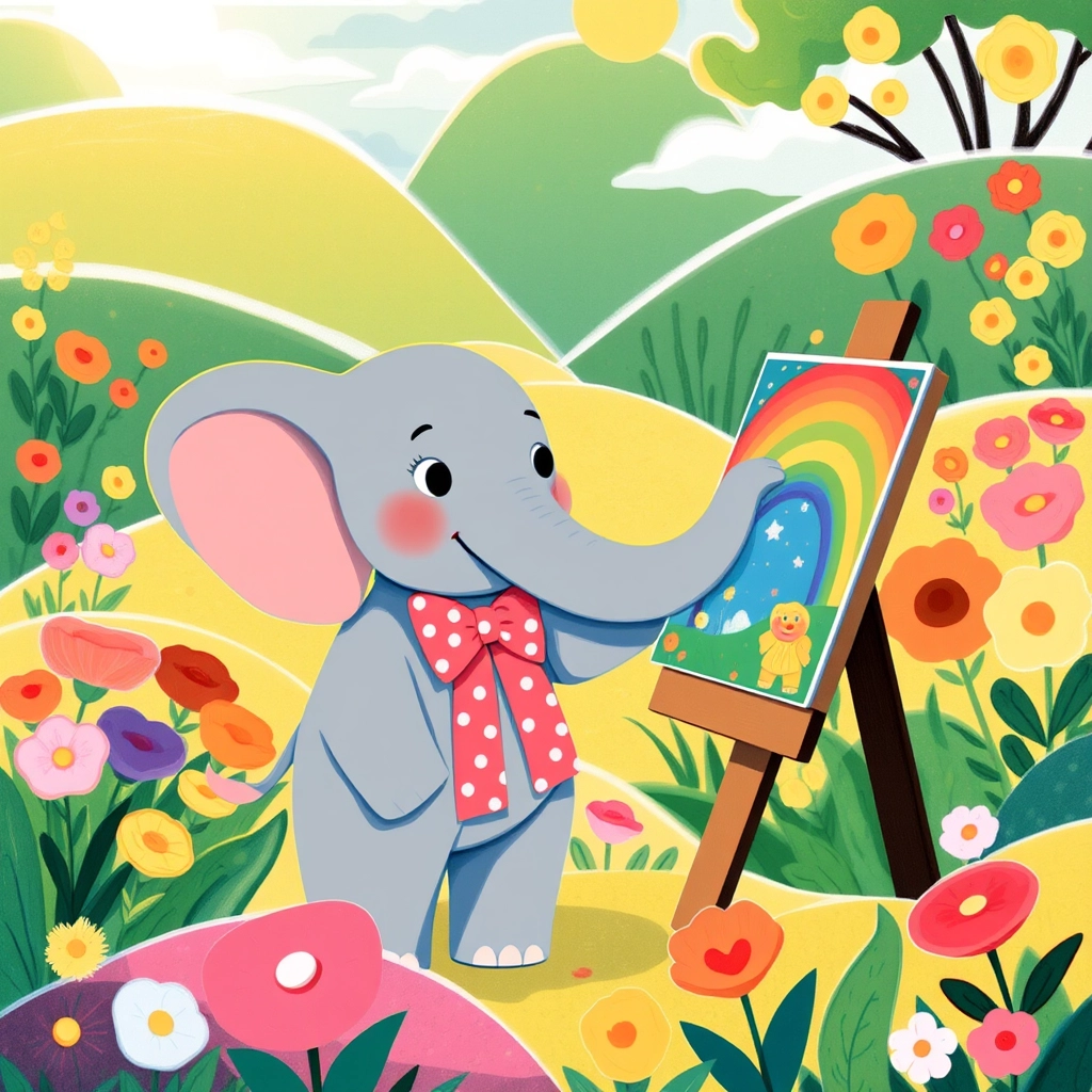 Together, they ventured further until they saw [Ellie](T763QQCJ), a joyful elephant, wearing her favorite polka-dot bow tie, painting with her trunk on a big canvas in the meadow.