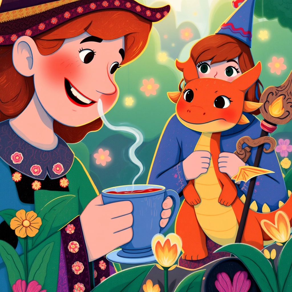 Together, they gathered some of the flowers and made a warm tea. 'Now, take a big sip!' [Lila](6FRRQGWD) encouraged. [Ember](NRP4XRC4) hesitated but took a deep breath and drank. A moment later, she hiccupped—and a small burst of flame popped out!