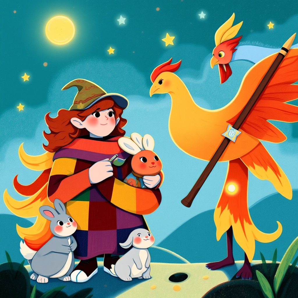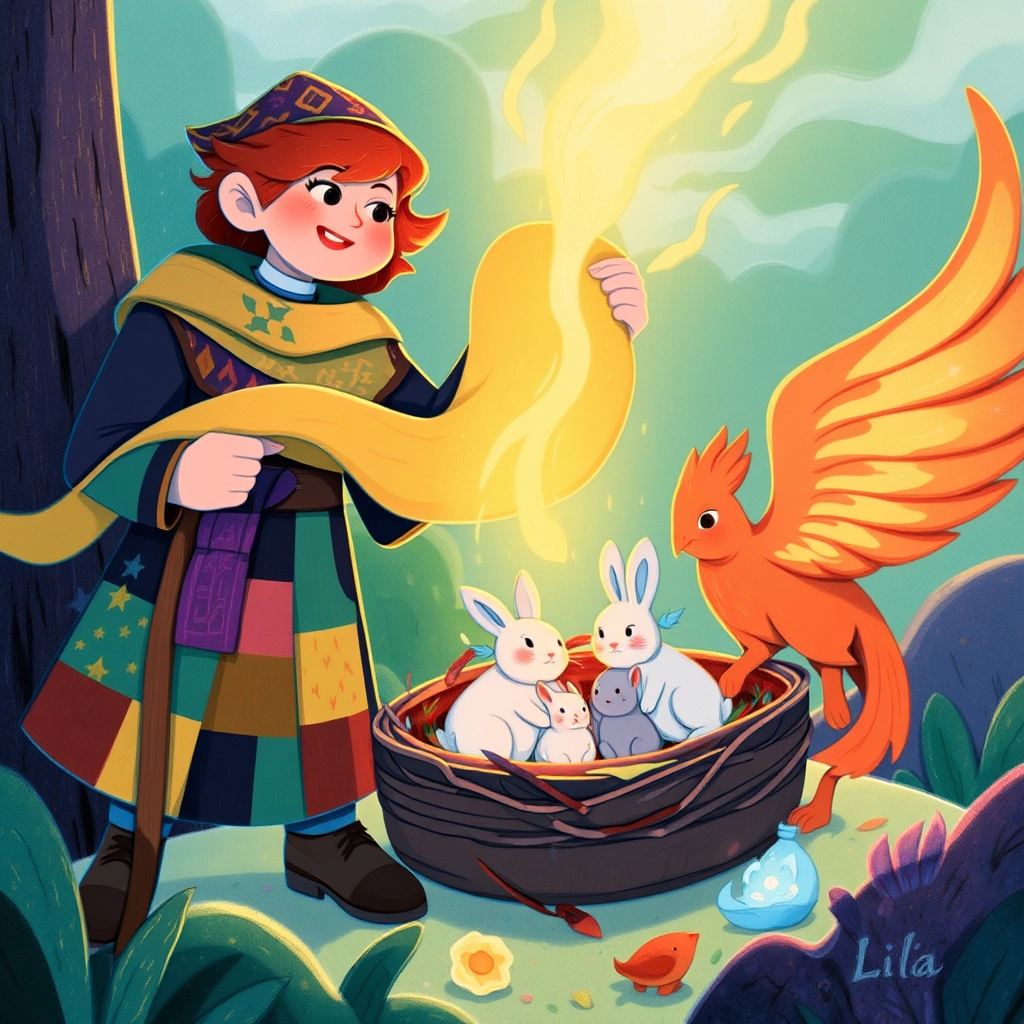 [Lila](6FRRQGWD) led [Blaze](LDQVKSHG) to a family of forest rabbits shivering in the cold. [Blaze](LDQVKSHG) tilted his head, unsure, until [Lila](6FRRQGWD) handed him a glowing scarf she’d woven. 'Now you can share your warmth.' Slowly, the phoenix draped the scarf over the rabbits and watched as they snuggled contentedly.