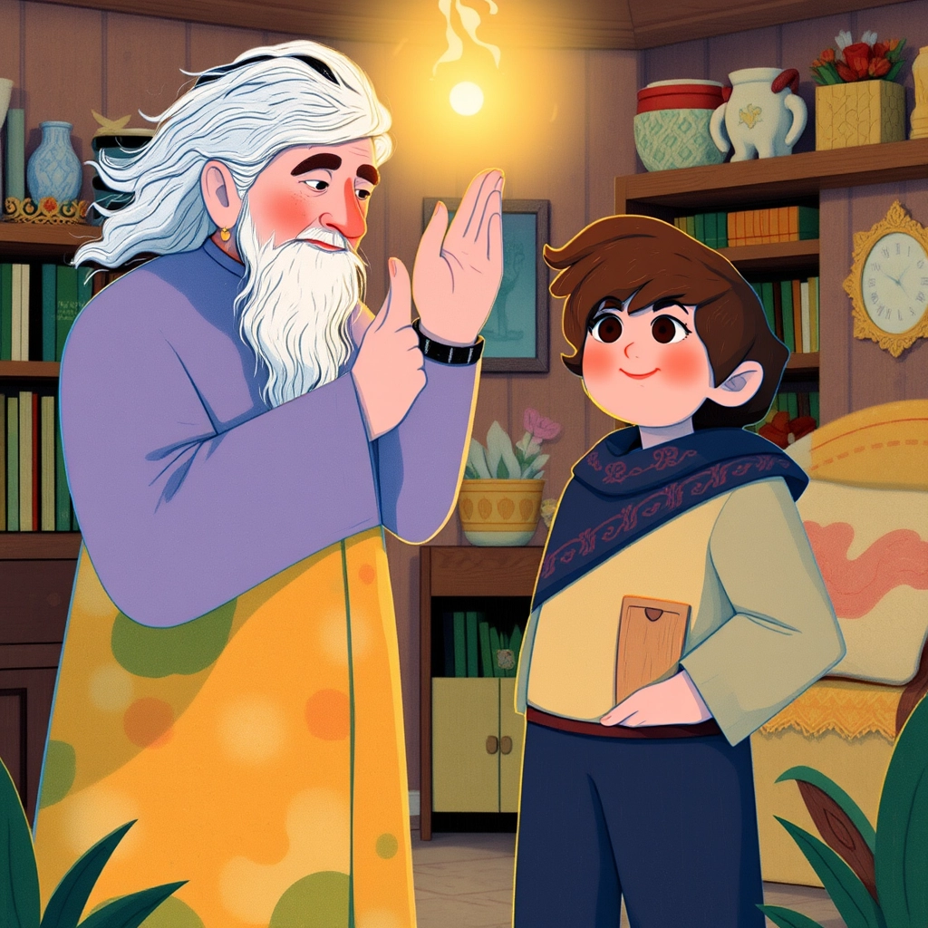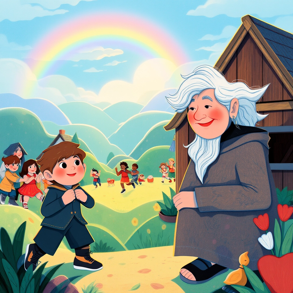 The old woman, grateful for the child’s kindness, waved her hand and said, 'You have a good heart. May your days be full of happiness and luck.' The child felt a warm, magical feeling as the kind words washed over them.