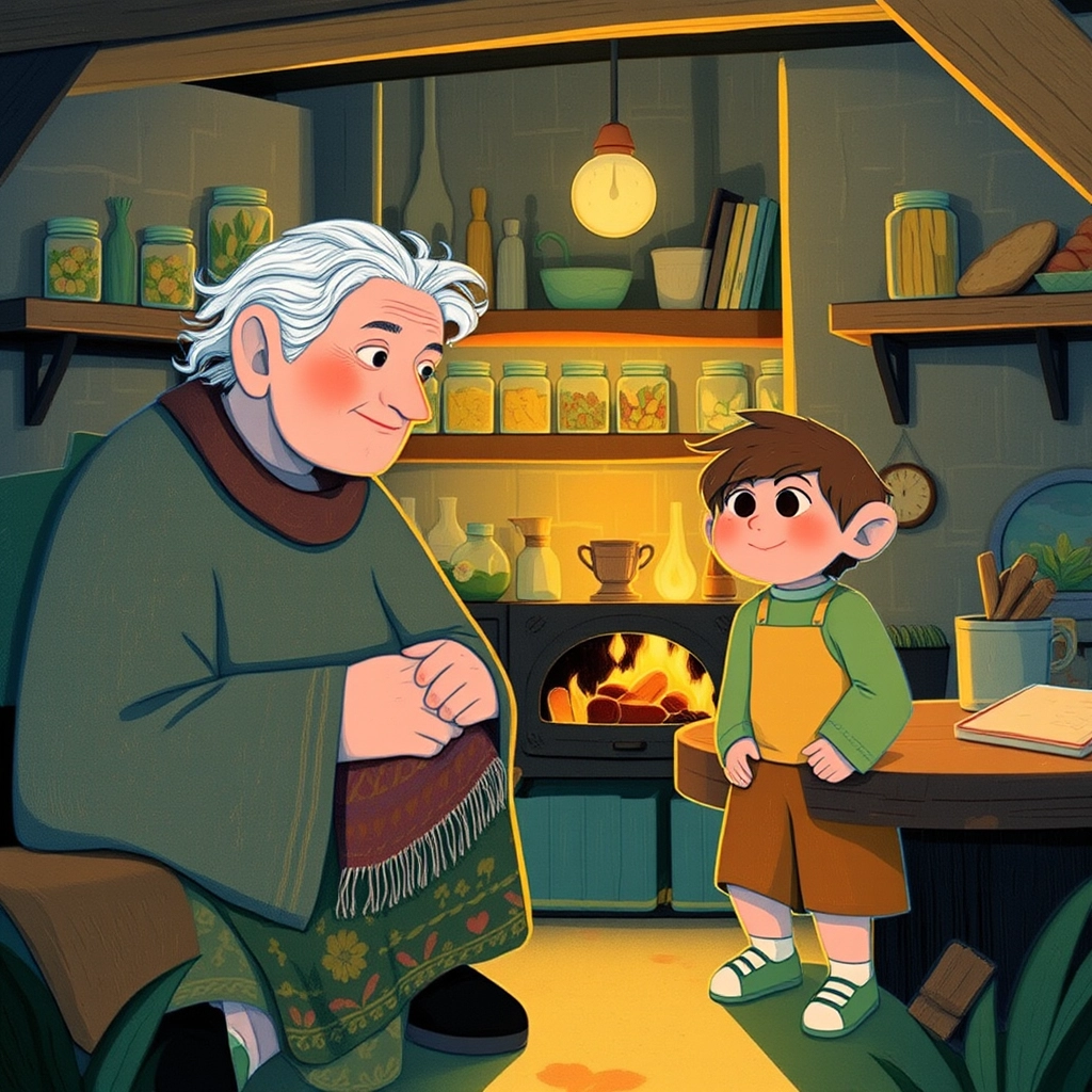 When they reached her house, the old woman invited the child inside. The small home was cozy and filled with the smell of freshly baked bread and herbs hanging from the ceiling.