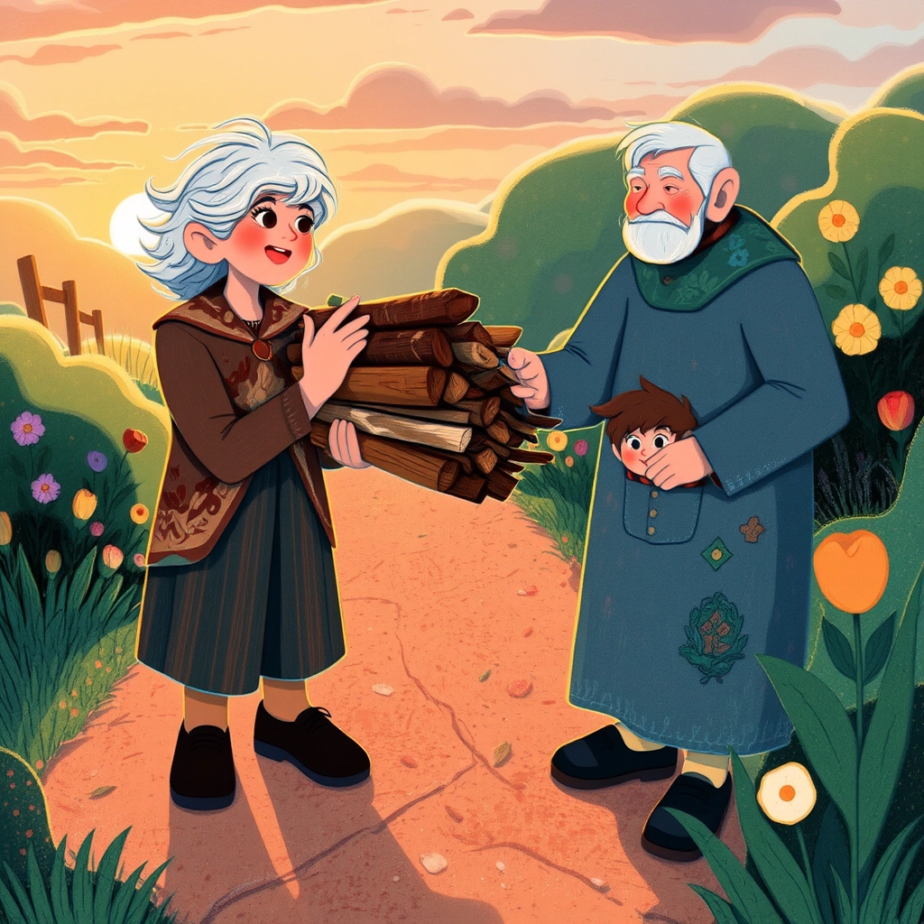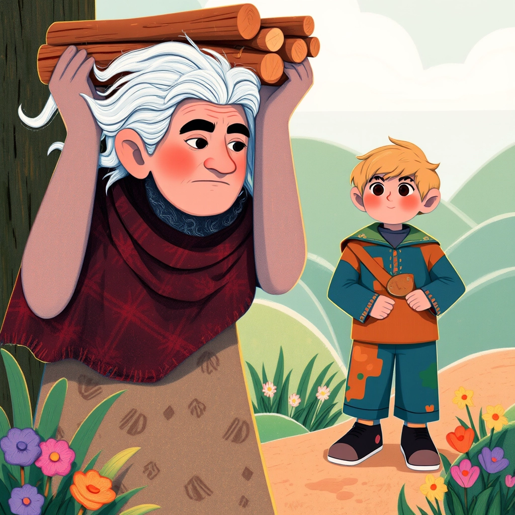Feeling sorry for her, the child quickly ran to her side. 'Let me help you!' they said with a bright smile, taking the firewood off the old woman’s head and carrying it on theirs.