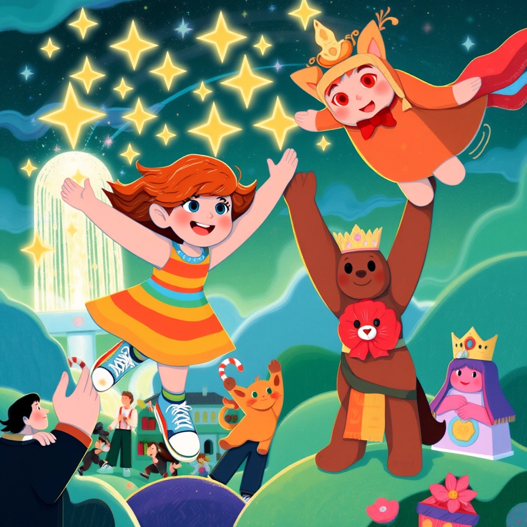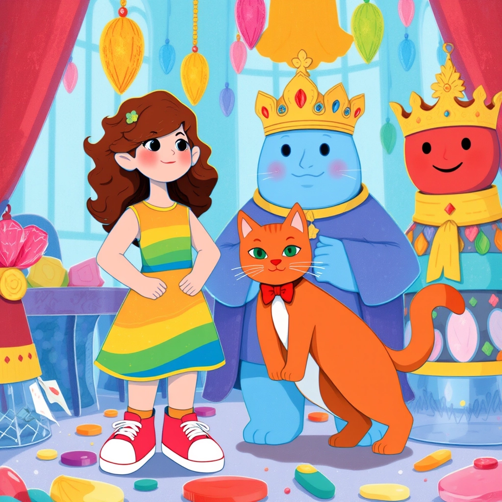 The chocolate fountain burst back to life, Sweetopia was saved, and the [Gummy Bear King](TK2ZQHQD) proclaimed [Ellie](95FP7FZV) and [Marmalade](BXGTFP3S) heroes. They floated back home with their hearts full of laughter and adventure.