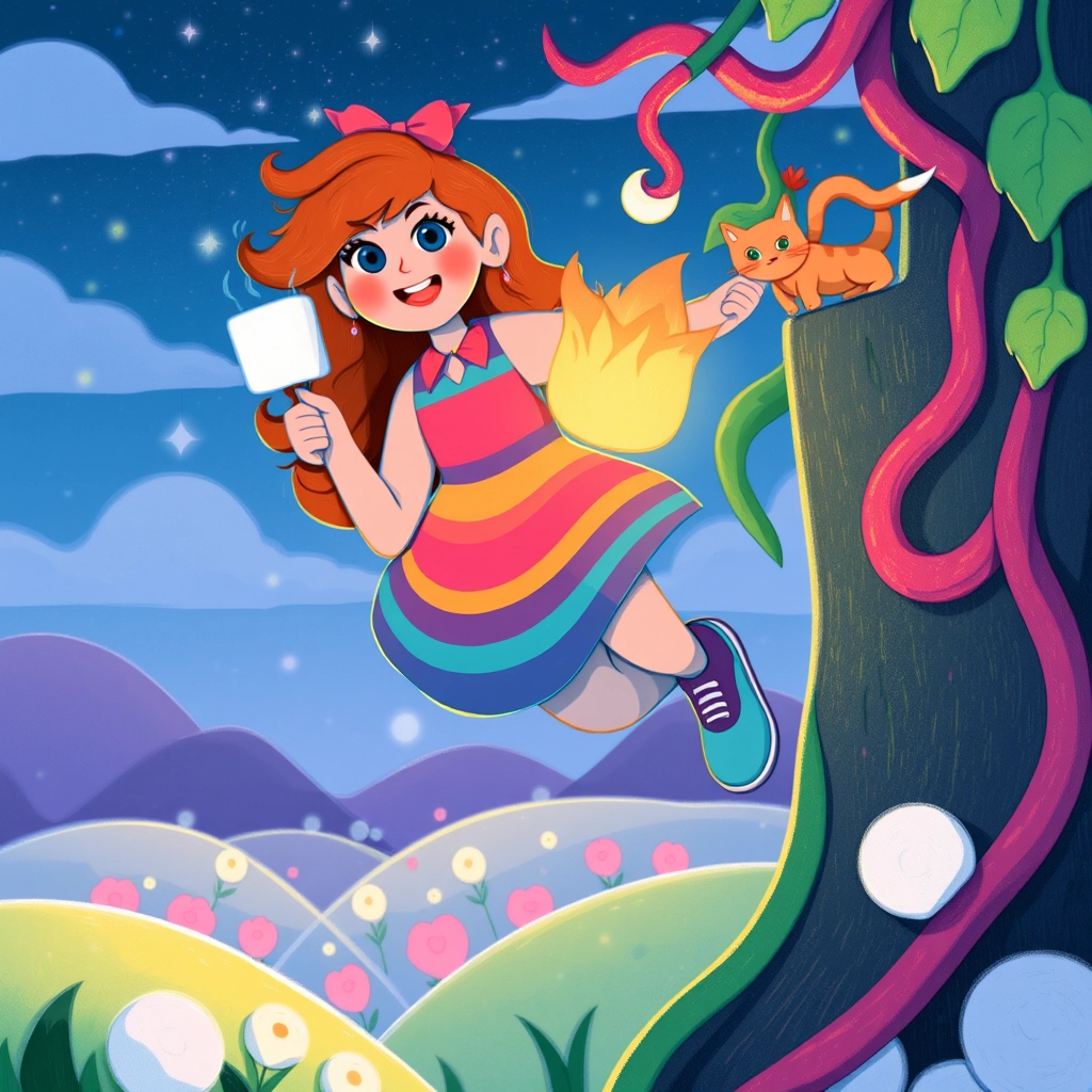 Curious, [Ellie](95FP7FZV) popped the jellybean into her mouth, and suddenly, she began to float! [Marmalade](BXGTFP3S) grabbed onto her foot, and together they drifted out of the candy shop into the sky.