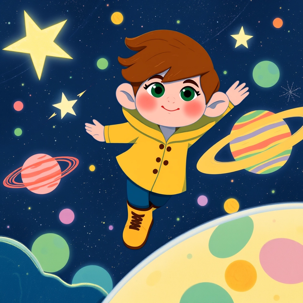 ‘What’s this one?’ [Jamie](B2G4CP55) asked, picking up a glowing purple book. In an instant, they were in space, zooming past stars, comets, and colorful planets in a starry galaxy!