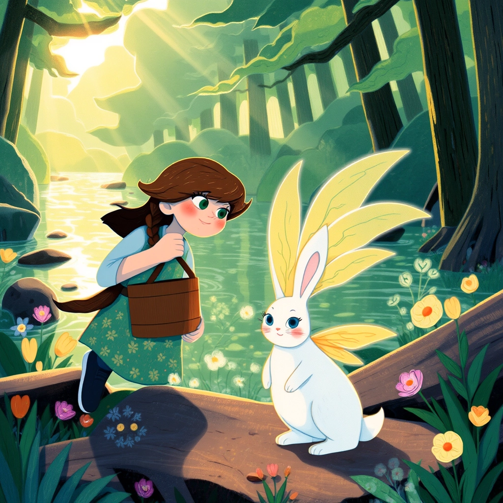 One day, as [Mia](T42JPM4J) walked to the river to fetch water, she met a curious little creature named [Sparky](73RS4BLY). He looked like a glowing rabbit with silver fur, shimmering blue eyes, and tiny golden wings.