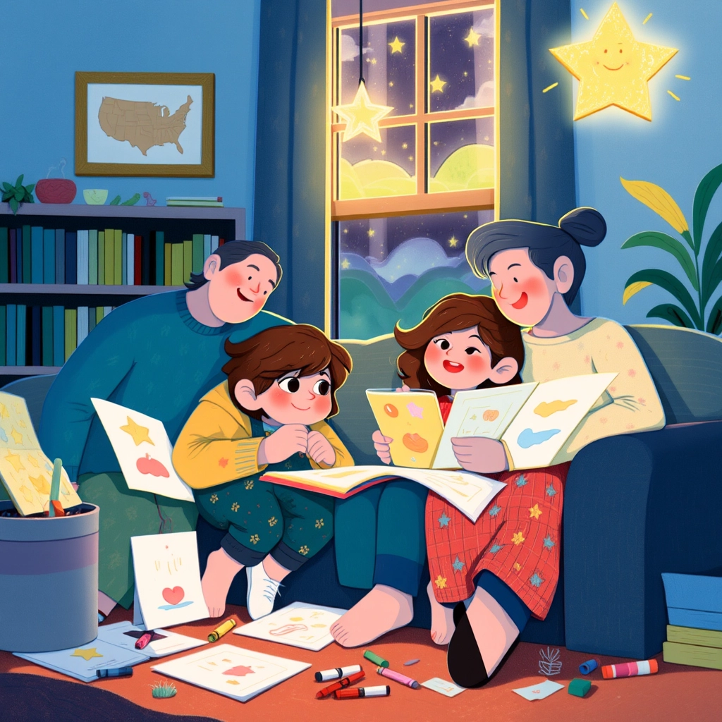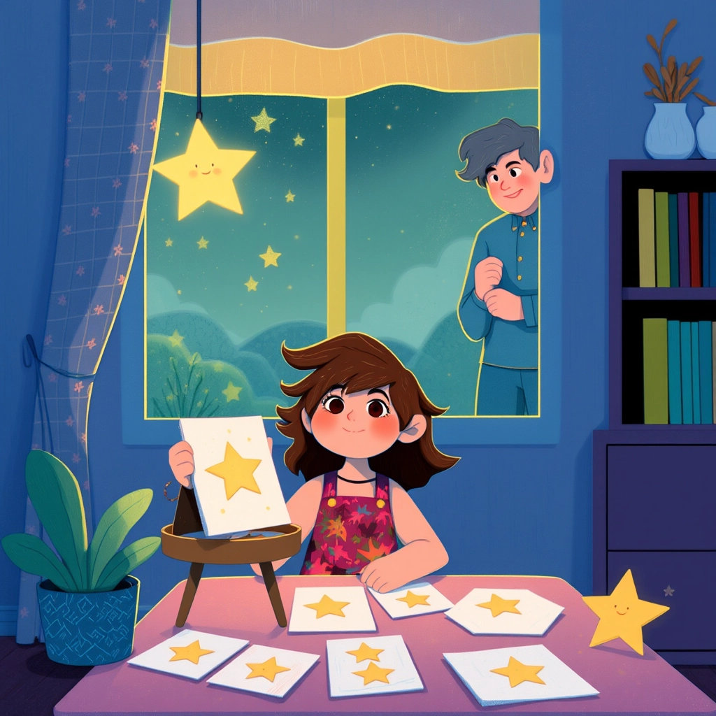 Each night, [Twinkle](PJGHHCCM) visited [Mia](RRTQ3WVH), and [Mia](RRTQ3WVH) started to feel a sparkling confidence growing inside her. She began sharing her star art with her parents, even though they still seemed so busy.