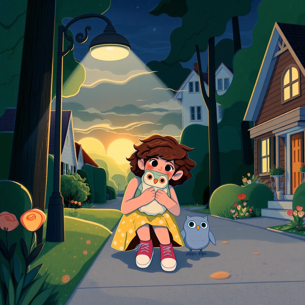 One quiet evening, the sun was just dipping below the horizon, casting a golden glow over a sleepy suburban street. Under a flickering street lamp, a young child named [Mia](L2QL344G) sat on the sidewalk, clutching her beloved stuffed owl, [Mr. Hoots](JCKYM4X3). She was crying, her big brown eyes filled with tears.