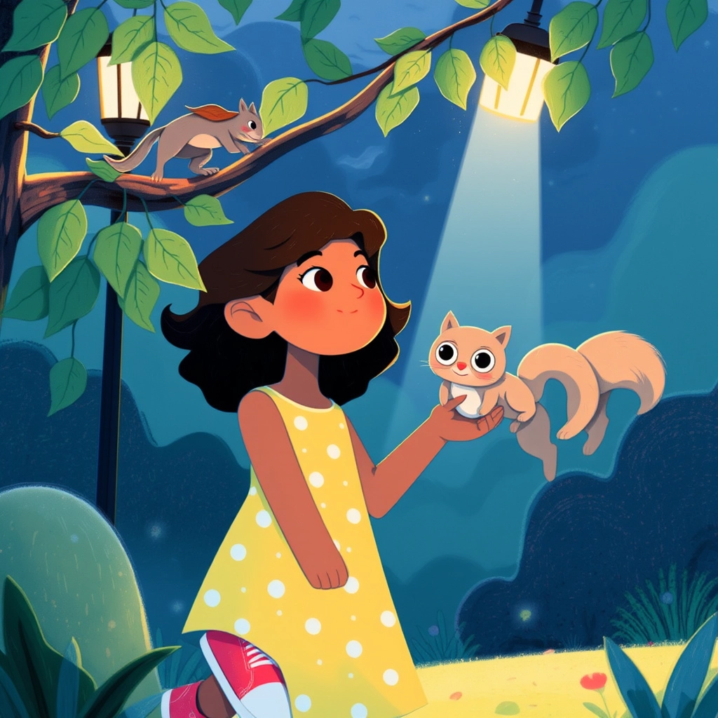 As [Mia](L2QL344G) wiped her tears away, she noticed a tiny squirrel staring at her from a nearby tree. The squirrel's bright, curious eyes twinkled in the dim light. 'Why are you crying, little human?' asked the squirrel, surprisingly in a soft, squeaky voice.