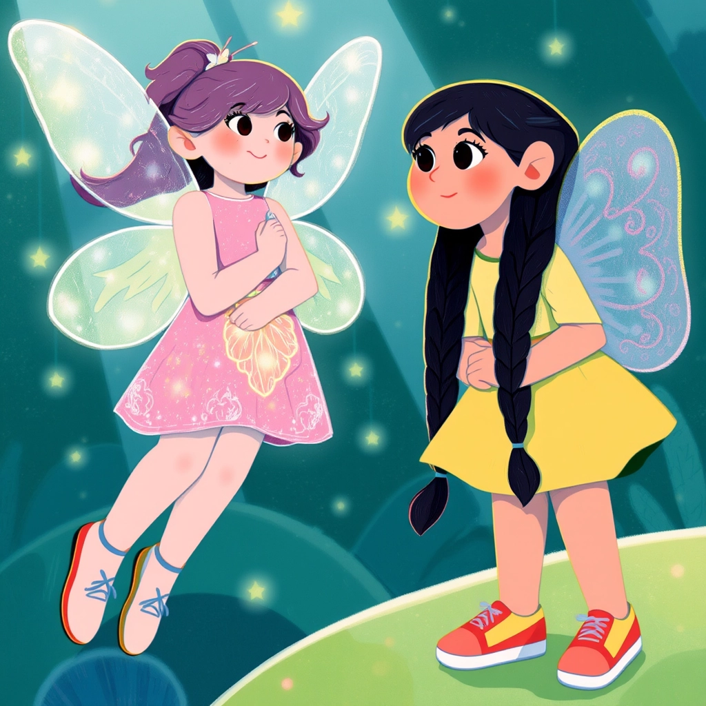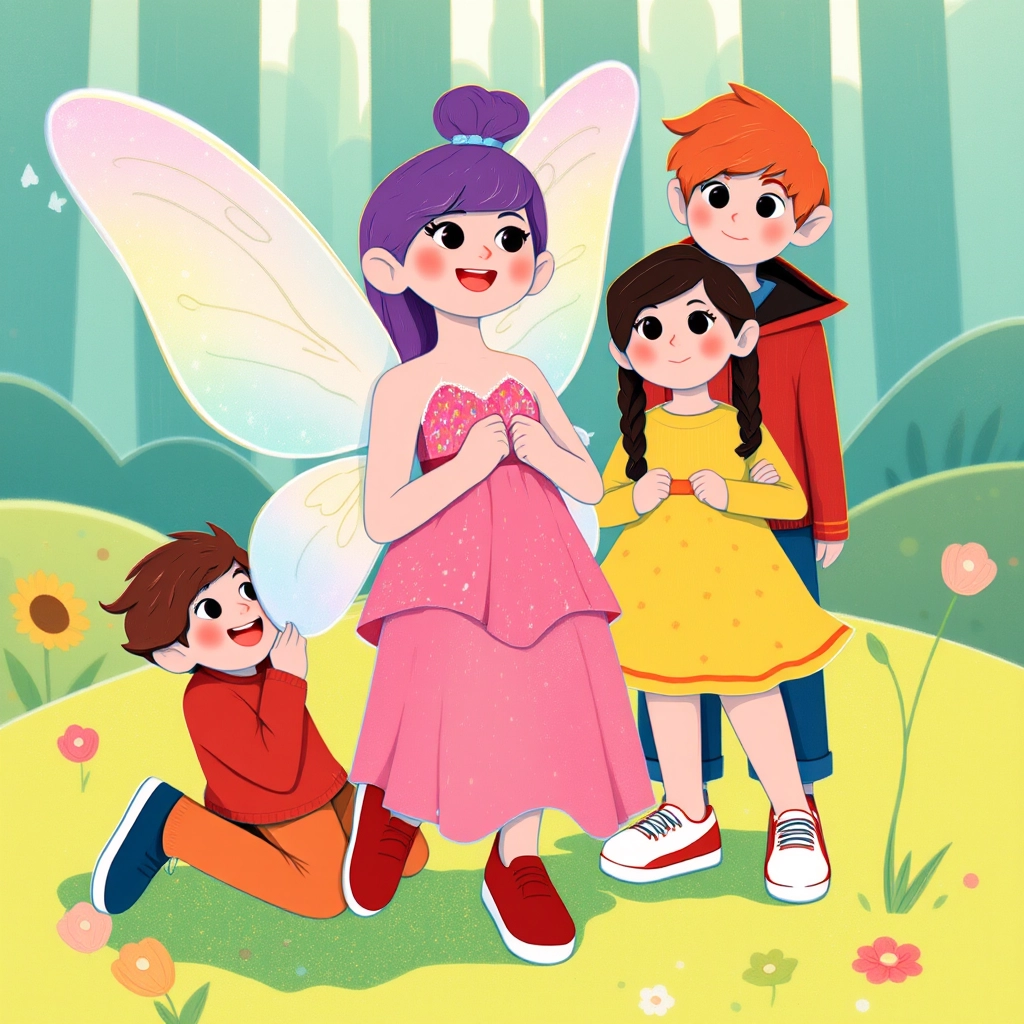 [Jack](99YSHSB9), [Emma](TFXWFXHN)'s brother, said, "Why don’t we help you find it?" [Lilia](5MWYGHKV)’s wings sparkled happily. "Oh, thank you! That would be wonderful!"