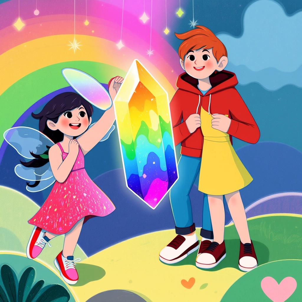 Finally, they uncovered the crystal, hidden deep under the flowers! The Rainbow Crystal shimmered like all the colors of the world were trapped inside.
