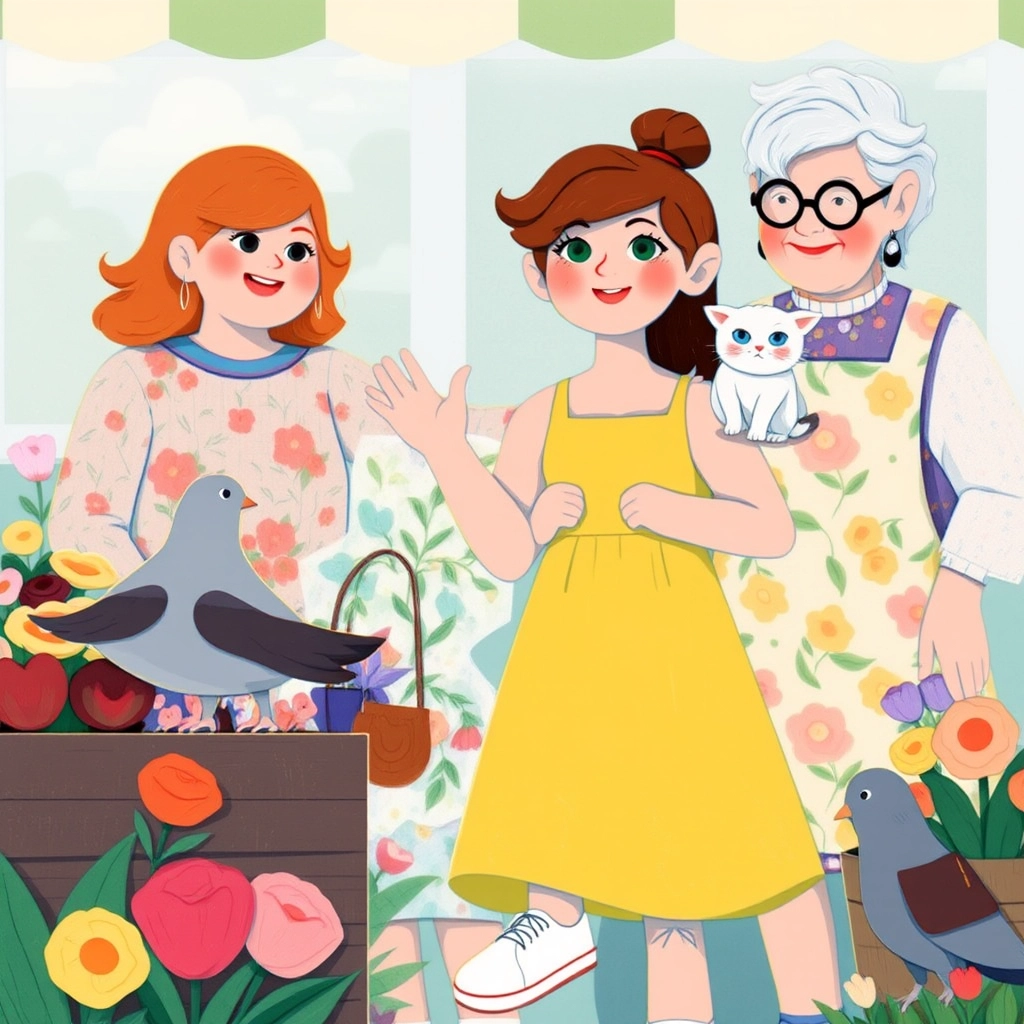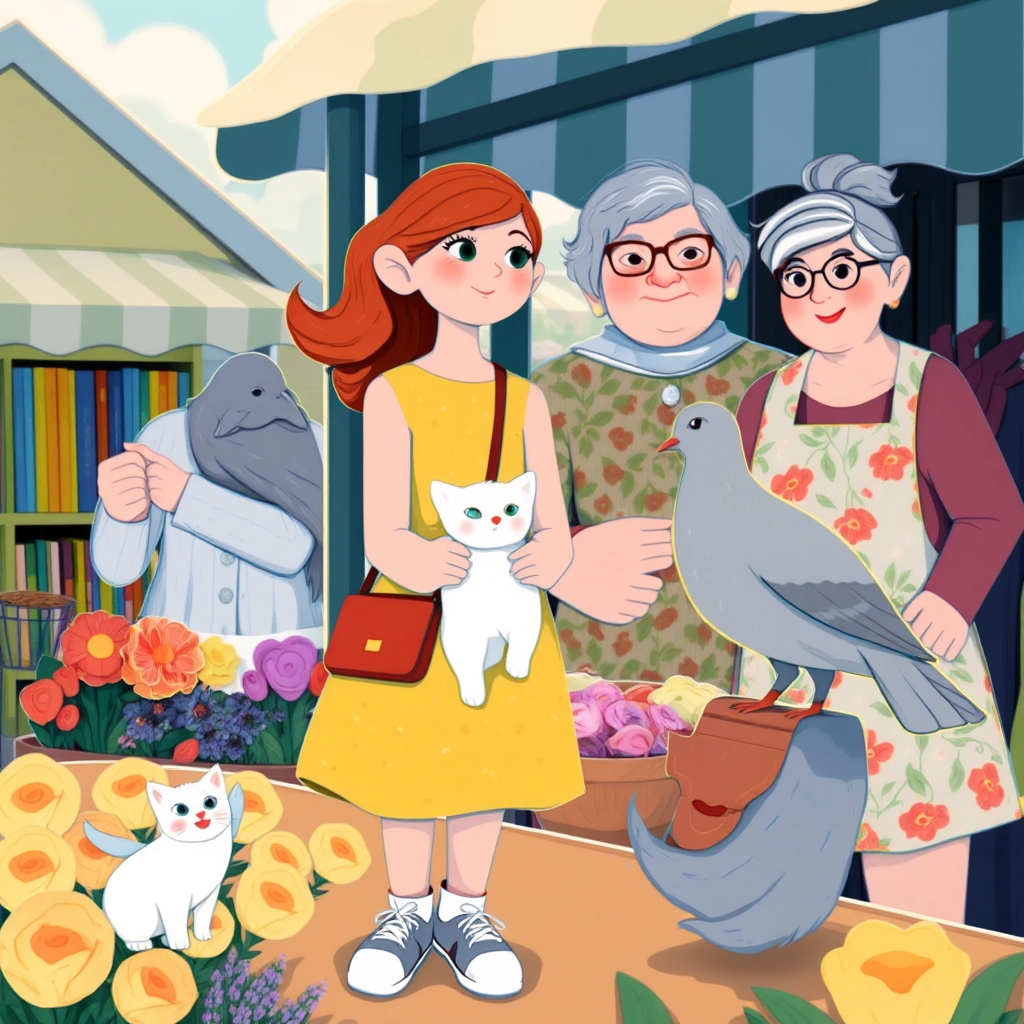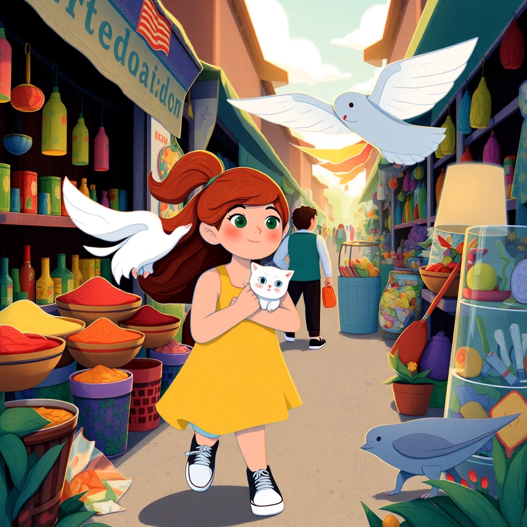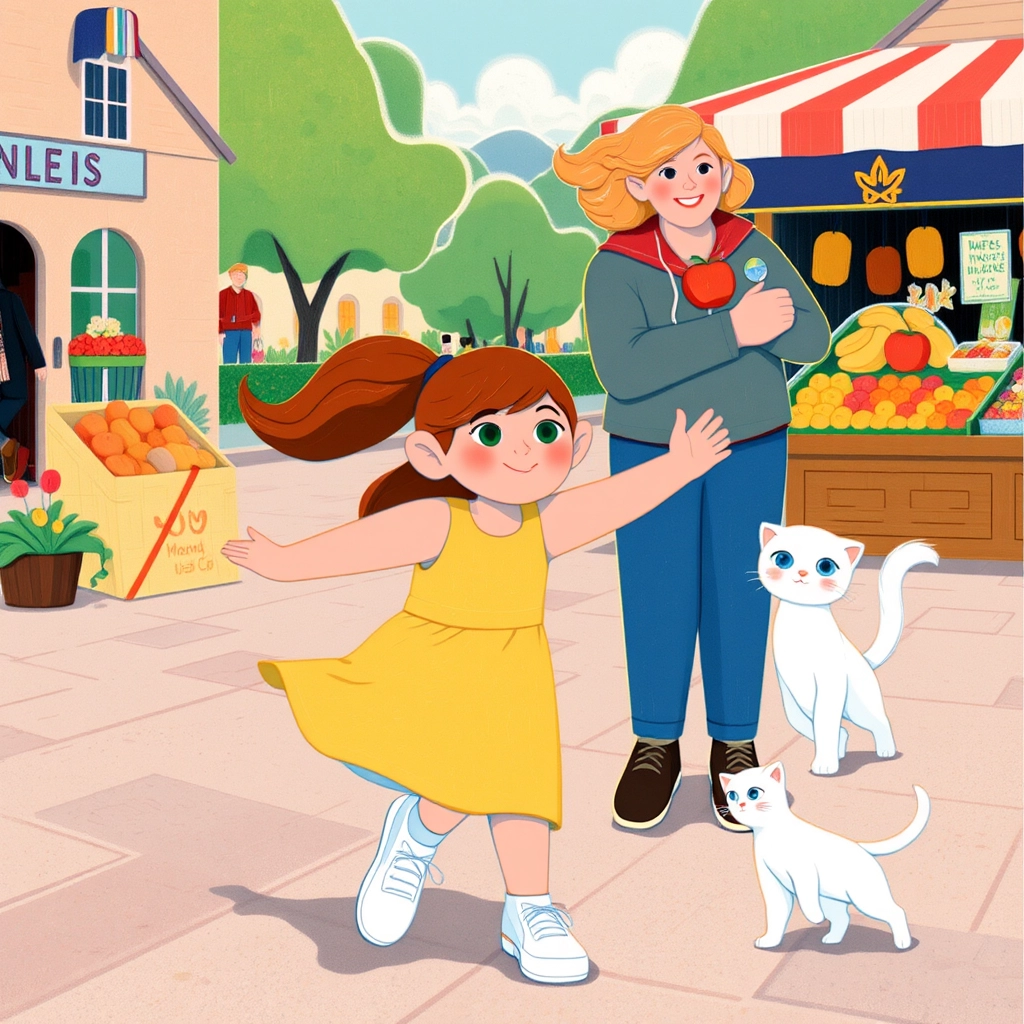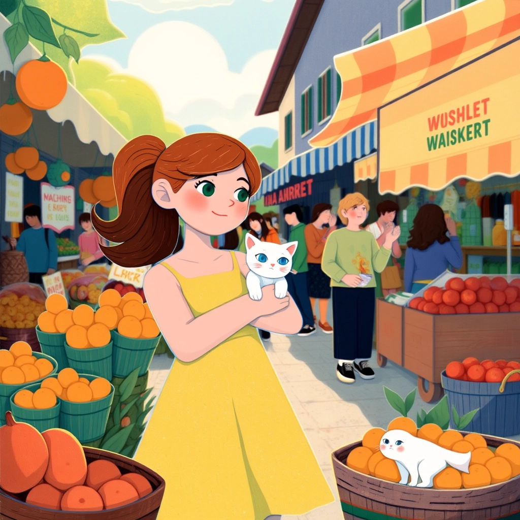 It was a bright sunny morning when [Mia](V9S6PD7F) and her fluffy kitten, [Whiskers](4QTXLL3L), set off to the market with her mom. The marketplace was buzzing with life—vendors shouting, customers laughing, and the air filled with the delicious smells of baked bread and sweet honey.