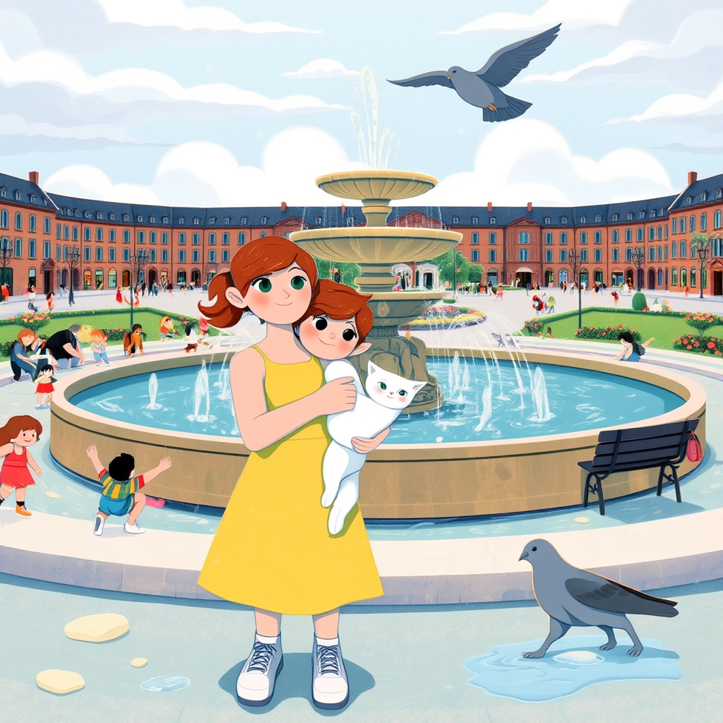 At last, they reached the market square! [Mia](V9S6PD7F) saw the big fountain and shouted, 'I remember this!' She ran to the fountain, looking all around for her mom.