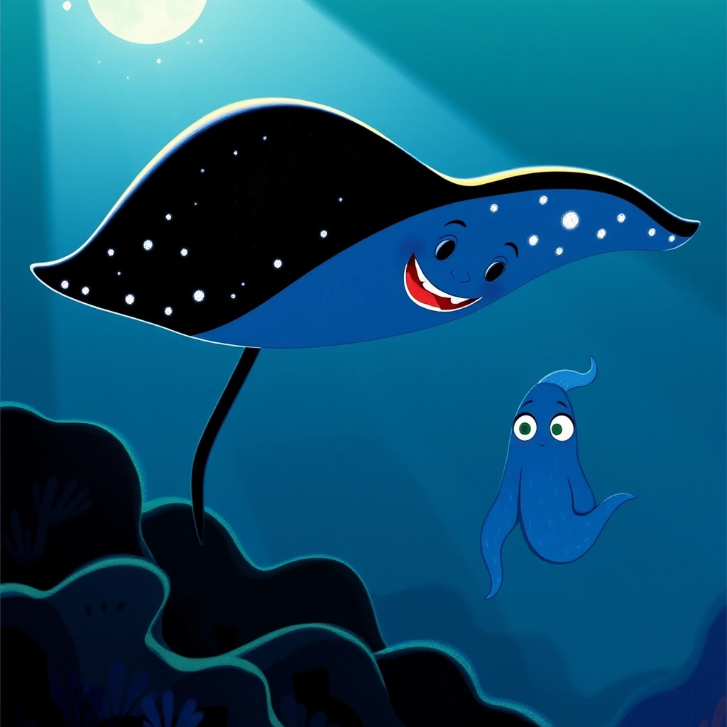 Just then, a friendly manta ray named Luna swam by, giggling. 'Maybe you have to lift it up—above the surface!' Luna suggested. Otto immediately understood. 'Of course! The puzzle wants the light of the stars to fix the coral,' he realized.