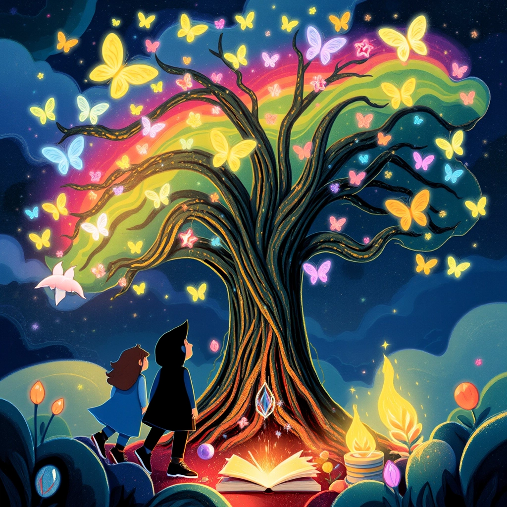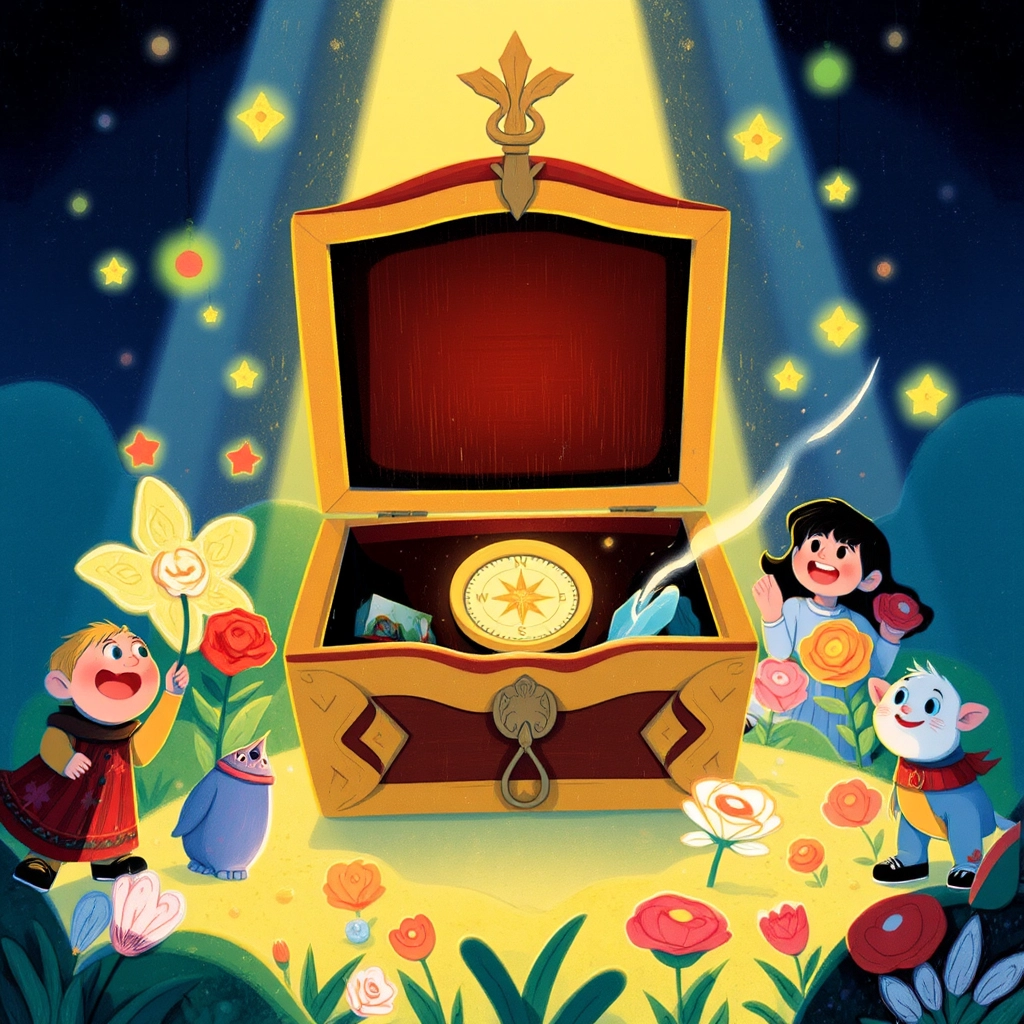 Following the compass, they reached a hidden glade where the tallest, most colorful tree sprouted. Inside its trunk glowed a treasure of forest knowledge and harmony.