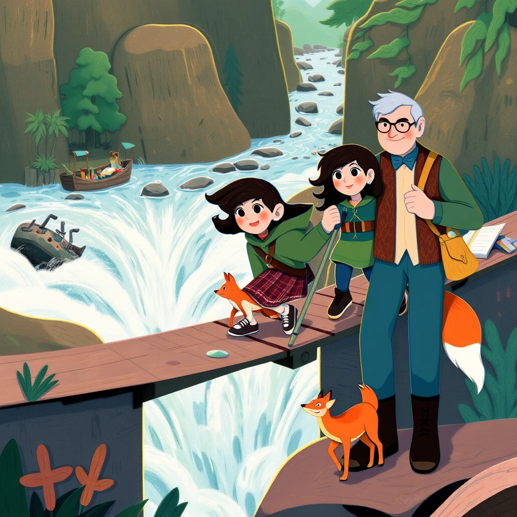 The journey began! The team wandered through towering trees and stumbled upon sparkling streams, but soon faced their first challenge: a wobbly bridge over a roaring river.