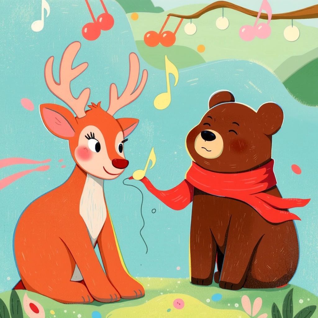 Later, [Benny](G6VZ6W6N) found [Lila the Deer](KY9DQY4F) quietly humming to herself. 'Music can be calming,' she explained. [Benny](G6VZ6W6N) listened to Lila’s tune, closed his eyes, and let the music help clear his busy mind.