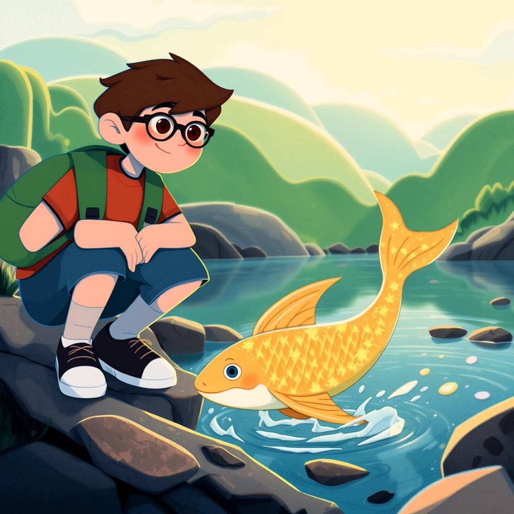 One sunny morning, as [Billy](4C49N4YN) walked along the river as usual, he noticed something unusual shining on the rocky bank. It was a golden fish, flopping and struggling to breathe.