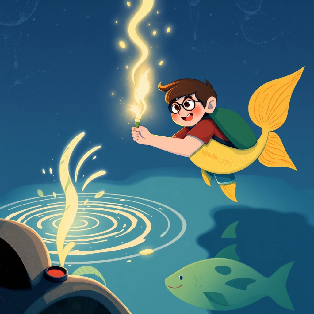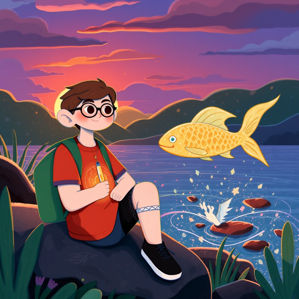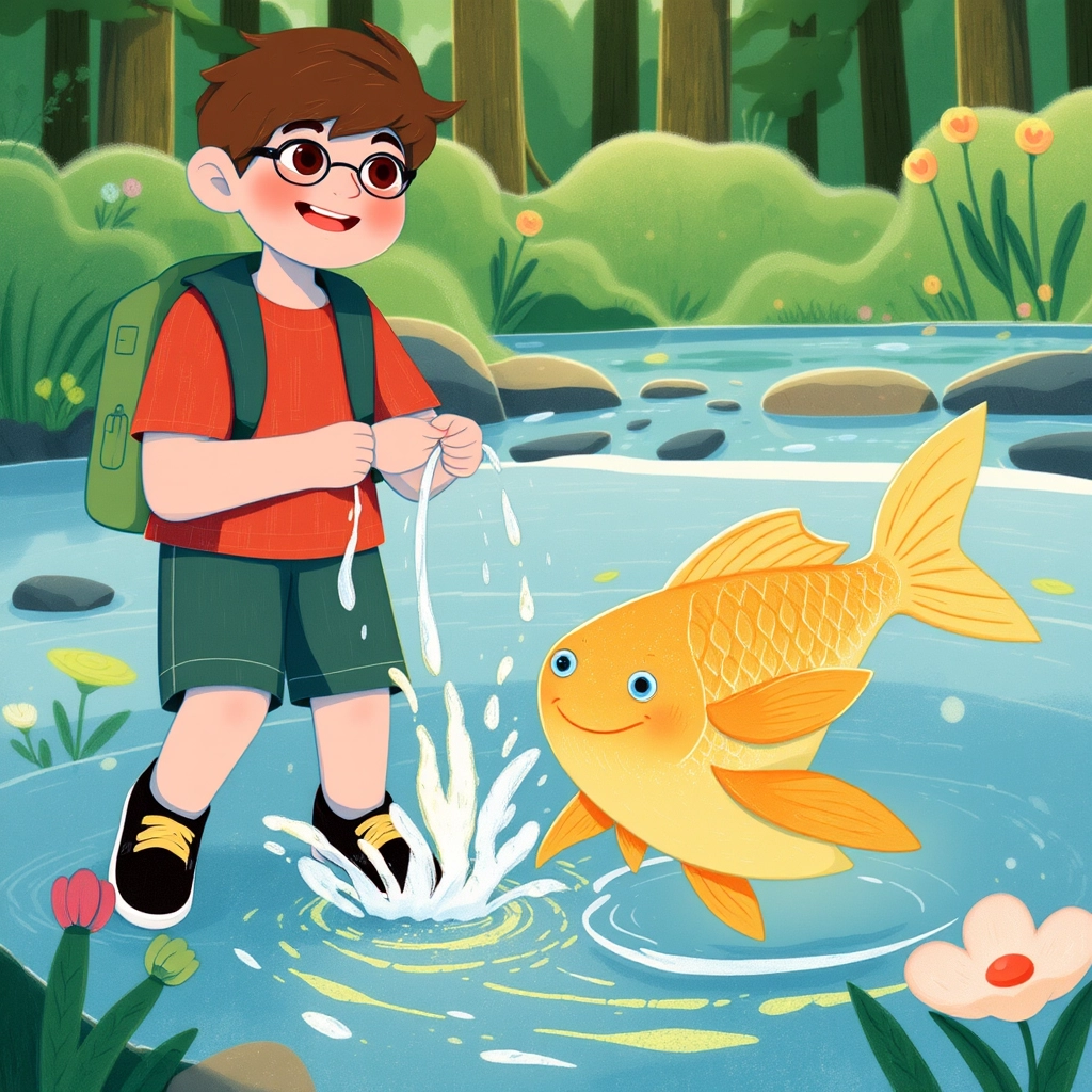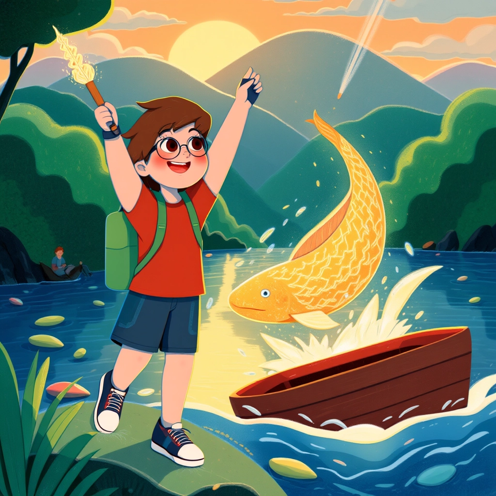 "You are a kind boy!" the golden fish suddenly spoke. "For saving me, I will grant you a gift: this magic pen. Whatever you draw or write with it will come to life!"