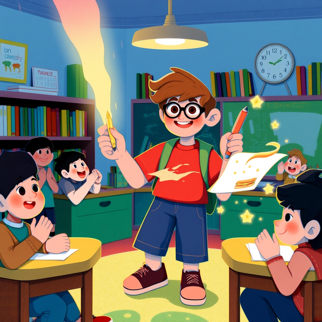 At school, [Billy](4C49N4YN) used the magic pen to help others. When a classmate forgot lunch, [Billy](4C49N4YN) quickly drew a sandwich, which appeared right before their eyes. Everyone called him 'The Magical Helper!'