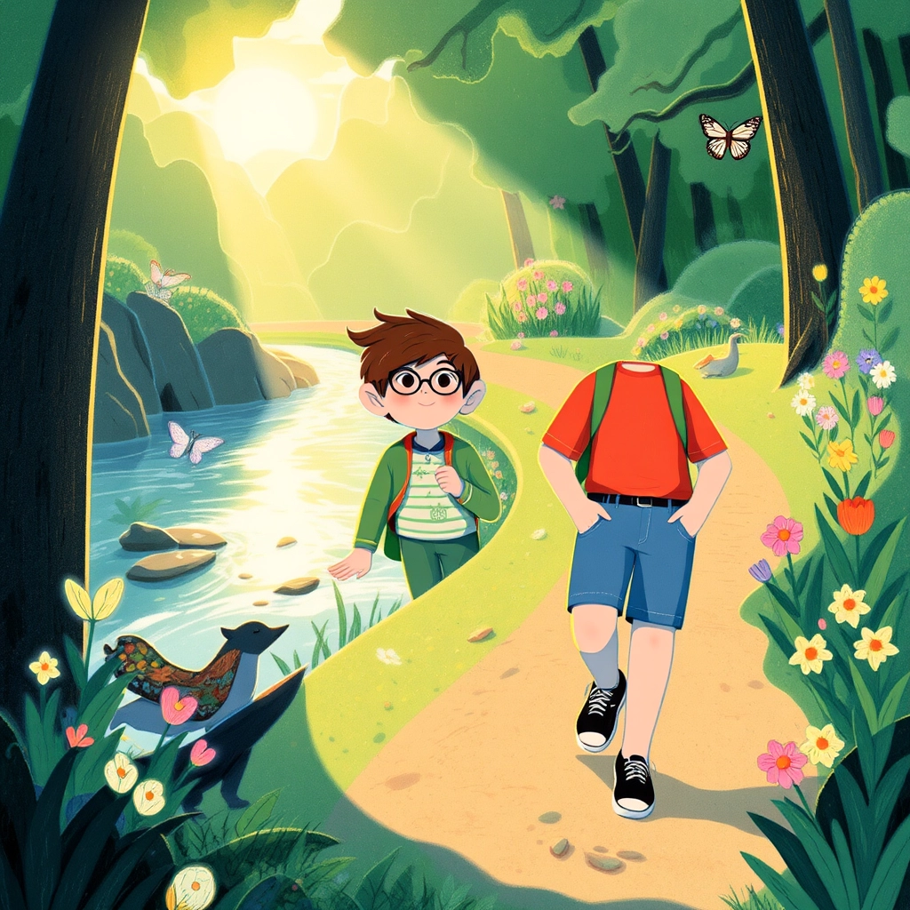 Once upon a time, [Billy](4C49N4YN), a curious and kind-hearted boy, walked to school every day along the sparkling River Glimmer. He loved listening to the birds chirping and watching the ripples in the water as he hummed his favorite songs.