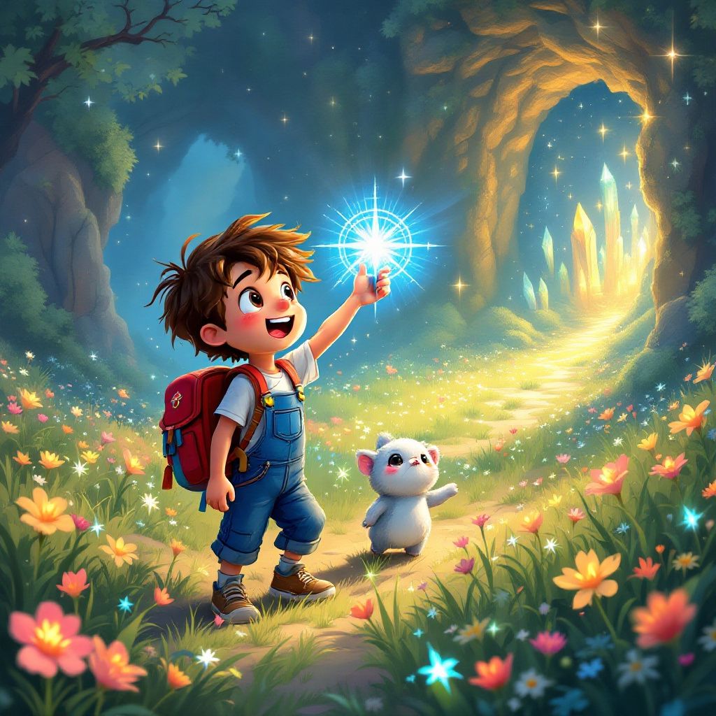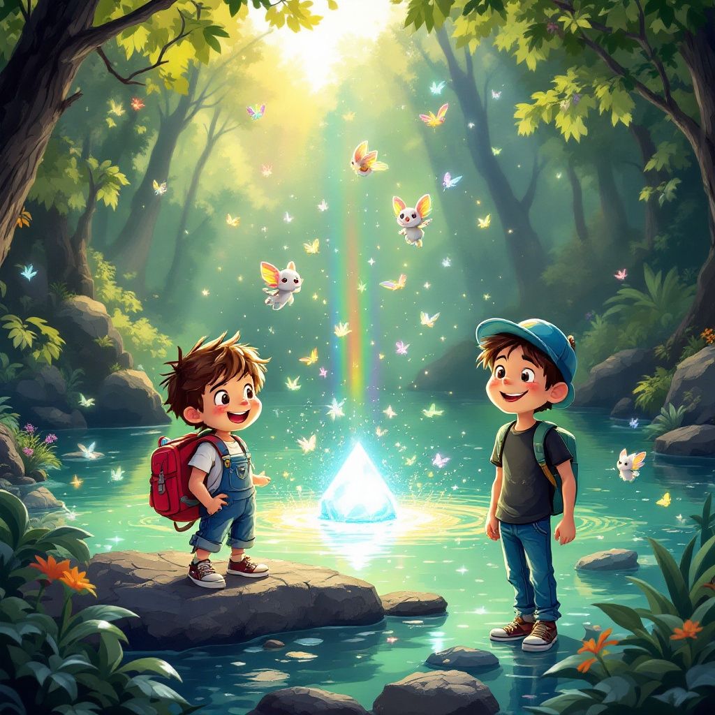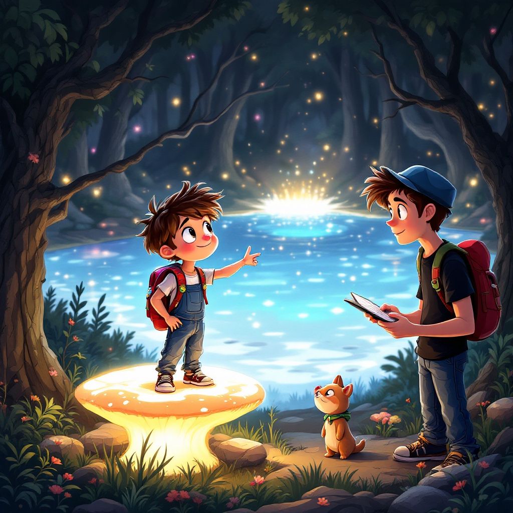Inside the cave, the boys found the Stone of Light—an orb that sparkled like a million stars! They carefully carried it back to the magical lake, following the compass’s glow.