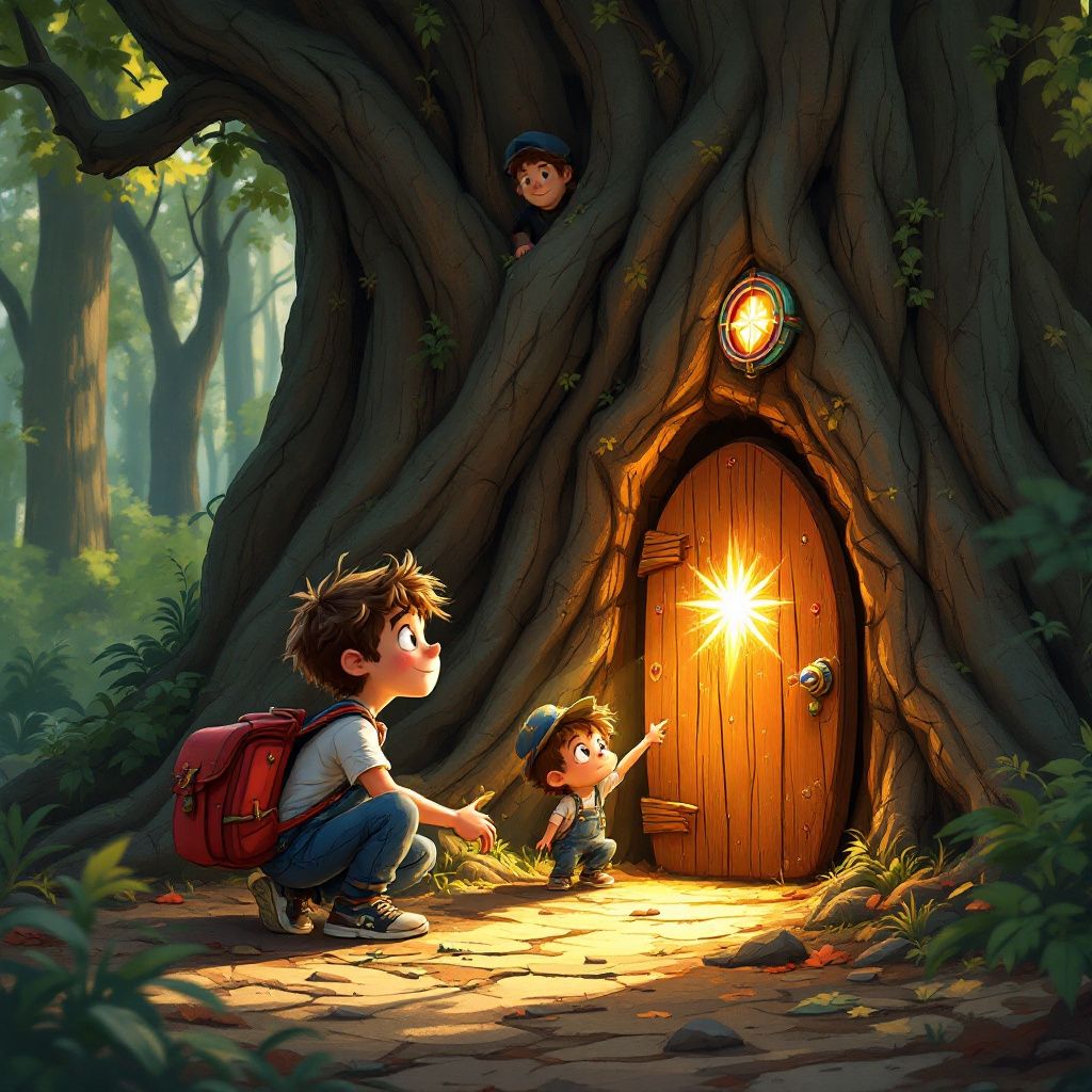 The boys followed the compass down the hidden trail. The trees stood tall, their leaves forming a shimmering green canopy. Soon, they discovered a tiny, sparkling door nestled in the base of an old tree.