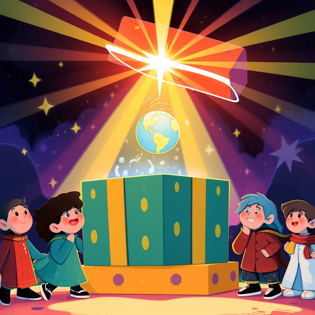 Suddenly, the gift began to glow and open, revealing a sparkling globe that shimmered with colors of the rainbow.