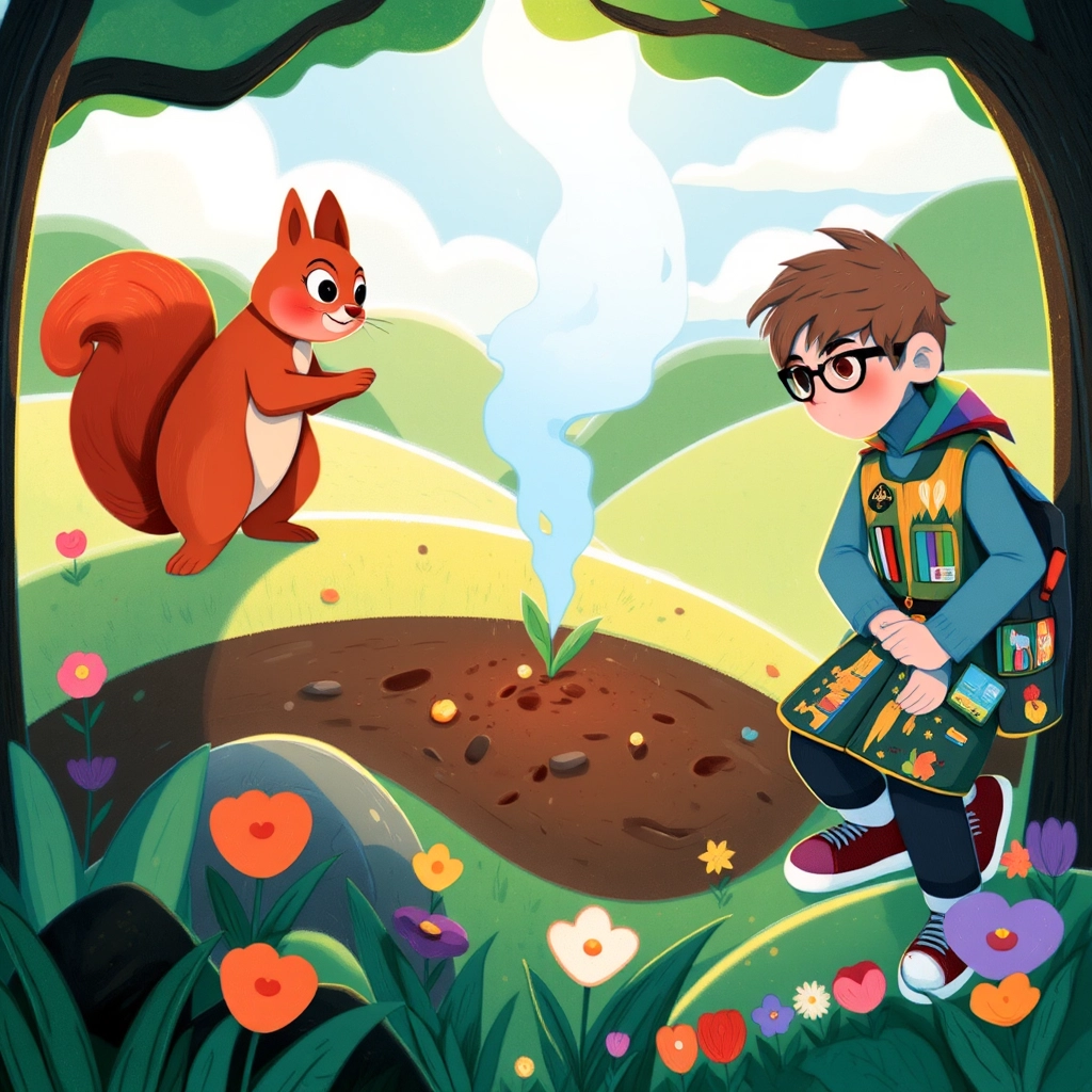 Their first task was to replant a meadow injured by a storm. [Max](ZB3JMKZB) scurried to gather nuts, [Penny](5KXR3WV5) helped scatter seeds, and [Leo](M5BSYNWZ) used his invention to water the soil efficiently.