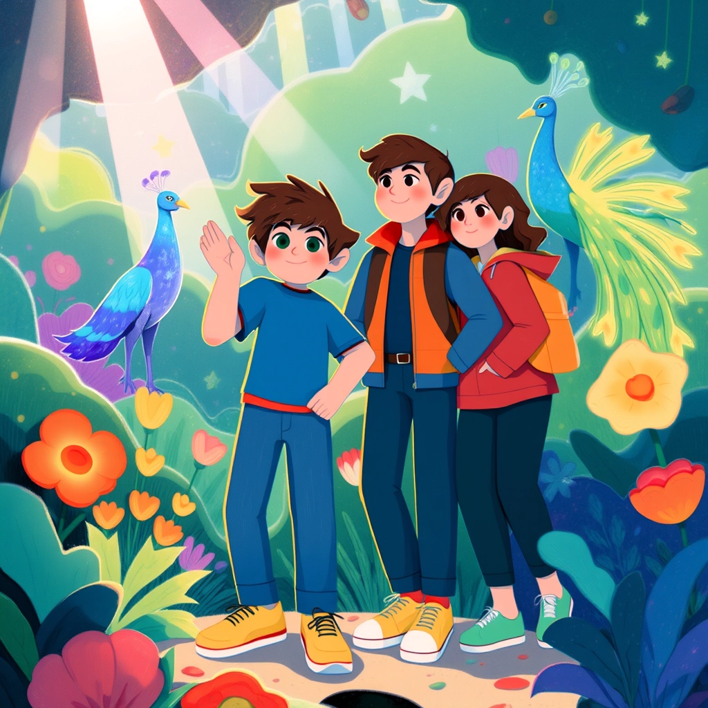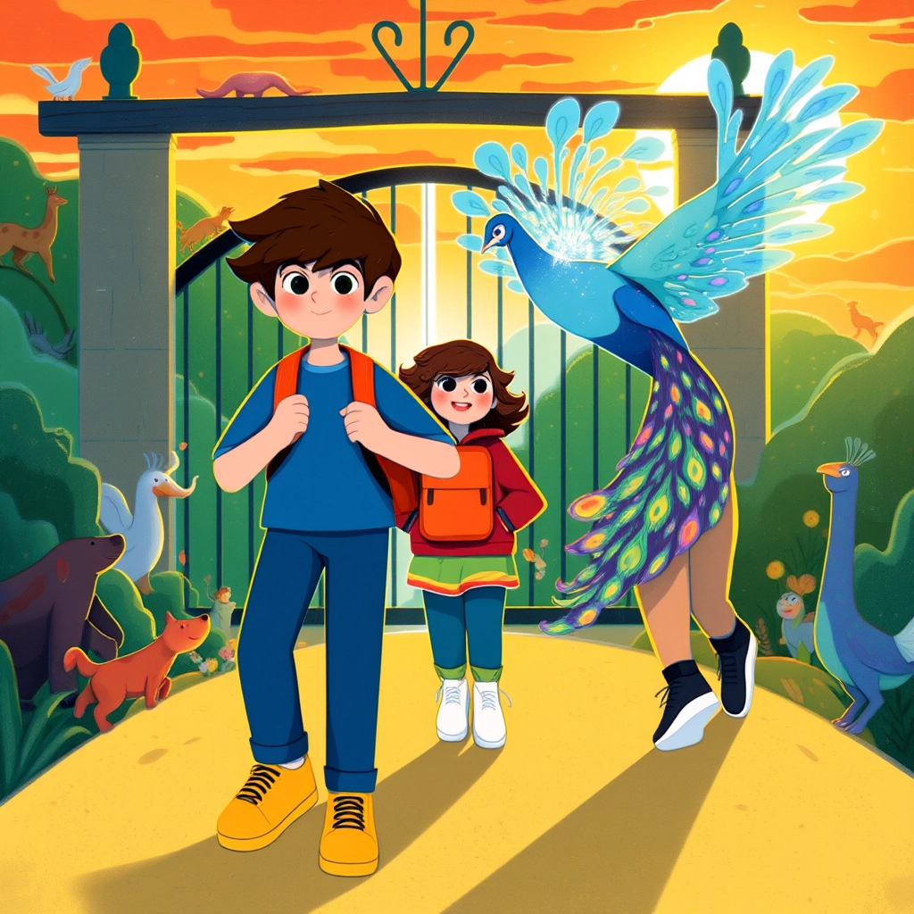 Curiosity bubbling, they stepped through the gates and were greeted by animals unlike any they'd ever seen—a glowing peacock with rainbow feathers approached, glittering like stardust!