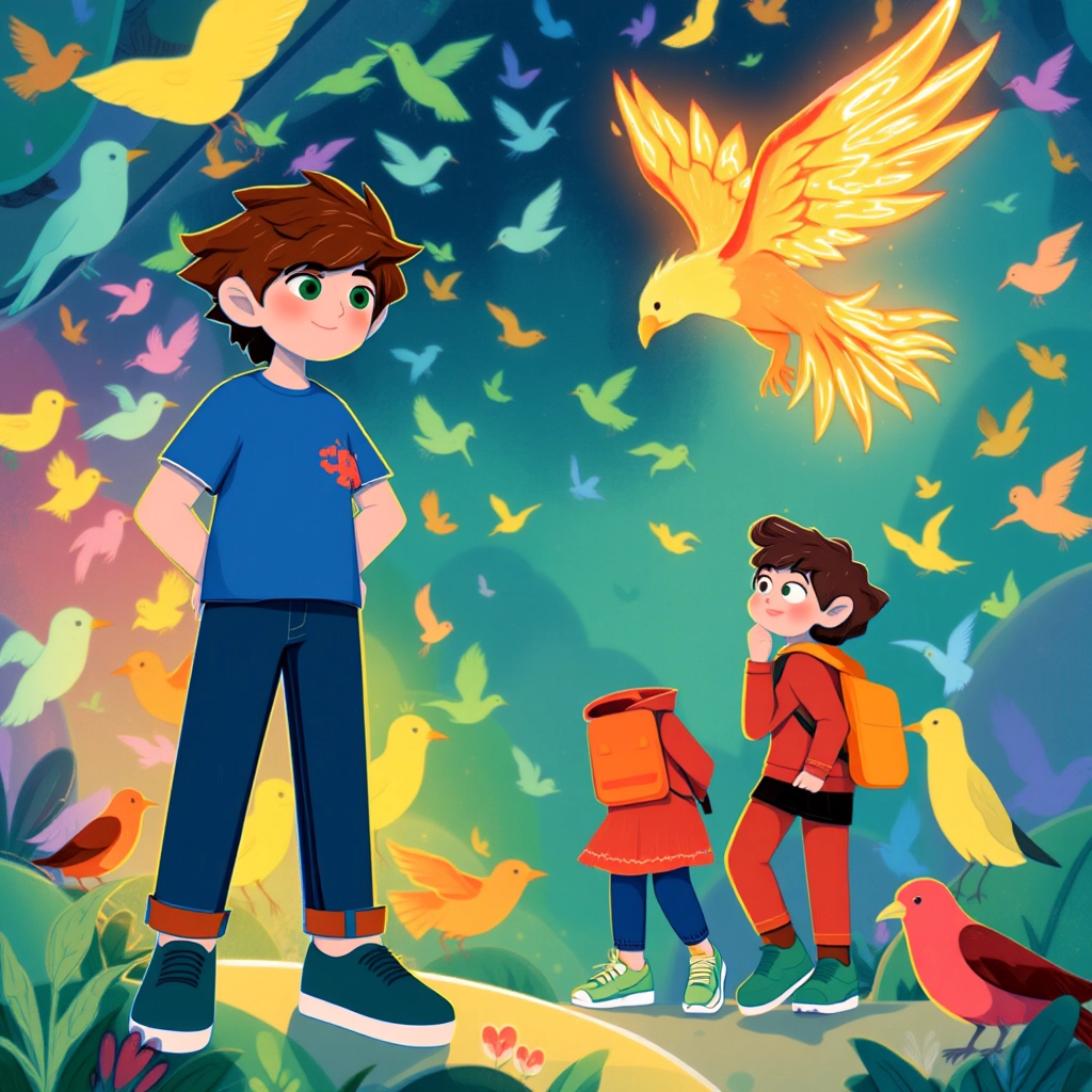 In the aviary, a fiery phoenix named [Phlare](C7NTZSY6) told them, ‘Kindness can brighten even the darkest days. A single act can make hearts soar like birds in the sky.’