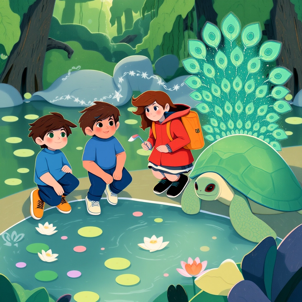 First, [Prism](6PGVGCFT) took them to the pond where a giant turtle with a shimmering emerald shell said, ‘I am [Tilda](7SVGNGJ2). I teach patience. You must wait for good things to grow!’