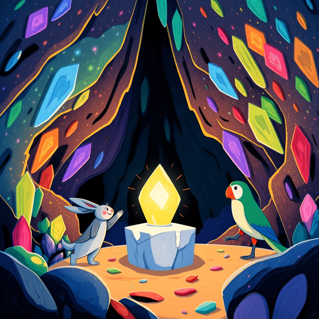 Finally, they reached the Crystal Cavern, a dazzling place filled with shimmering crystals. At its center rested the Golden Harmony Stone, glowing warmly as if it recognized the three friends.
