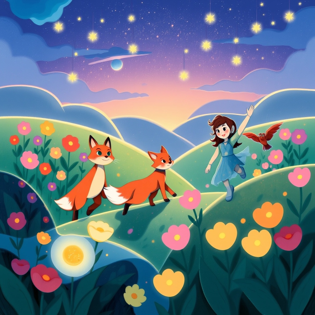 With teamwork and clever thinking, they crossed the bridge, entering an area filled with luminous flowers that buzzed gently like bees.