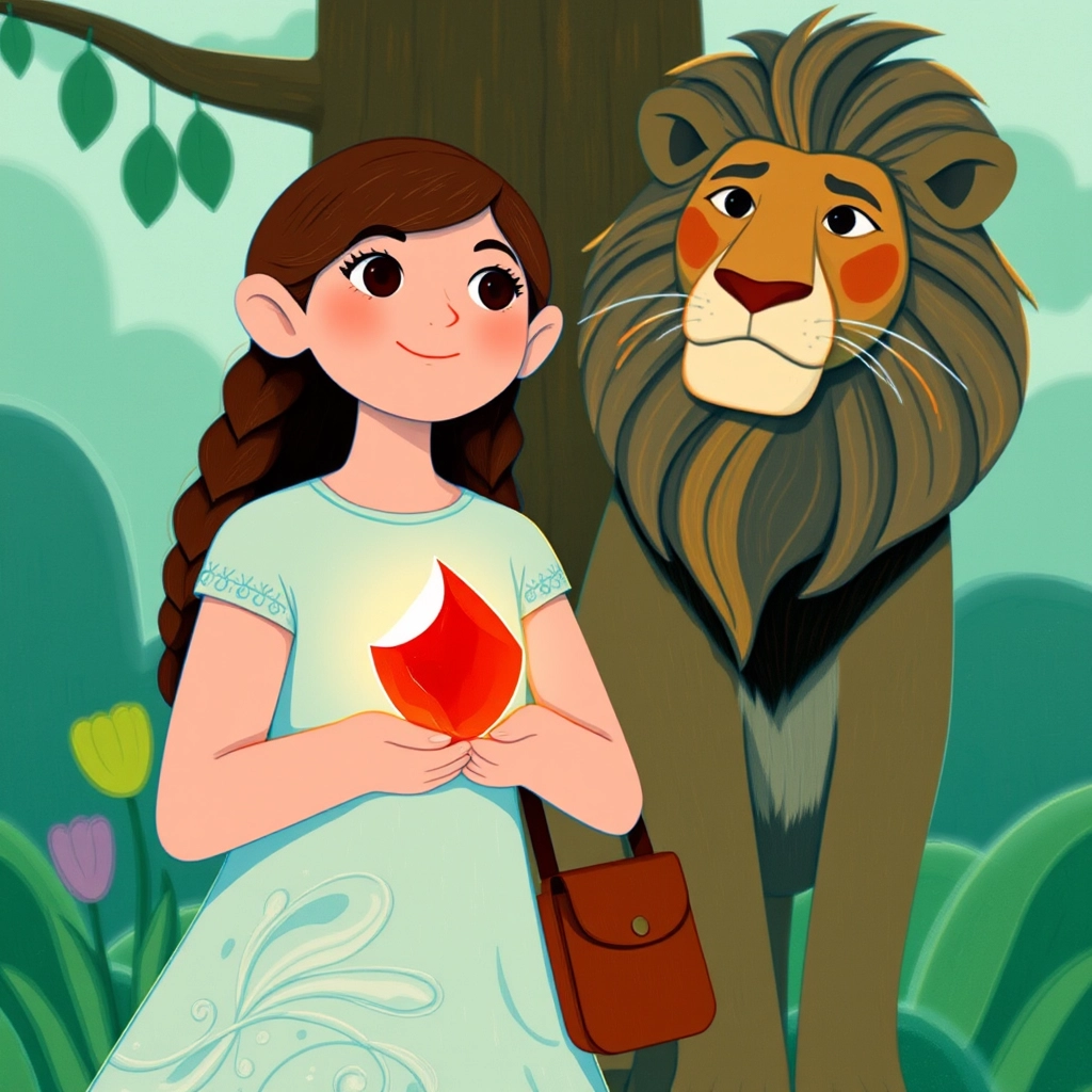 Inside the wonderland, a majestic white lion with glistening fur and piercing blue eyes approached [Lily](TRBJMFCB) with kind, noble grace.