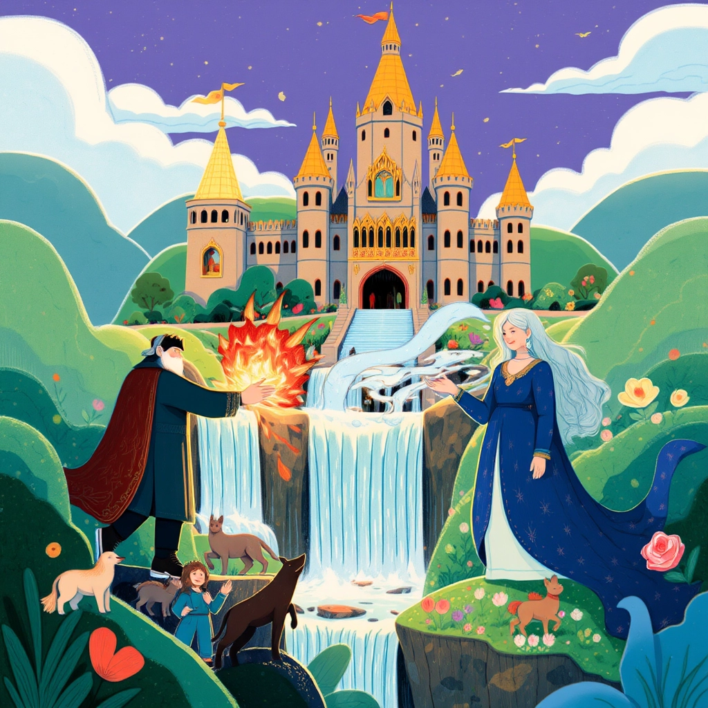 Once upon a time, in a kingdom of endless wonder, there lived a King and Queen with amazing magical powers. The King could conjure fire from his hands, while the Queen could summon water in the most extraordinary ways. Together, they ruled a kingdom that sparkled with magic and harmony.