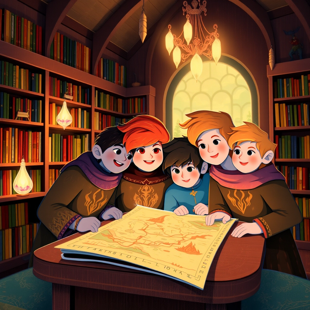 One sunny morning, the children discovered a map hidden in the Queen's library. The map had glowing runes and marked a location deep in the Mystic Forest. 'An adventure awaits!' proclaimed [Elias](FR25229Q) with excitement.