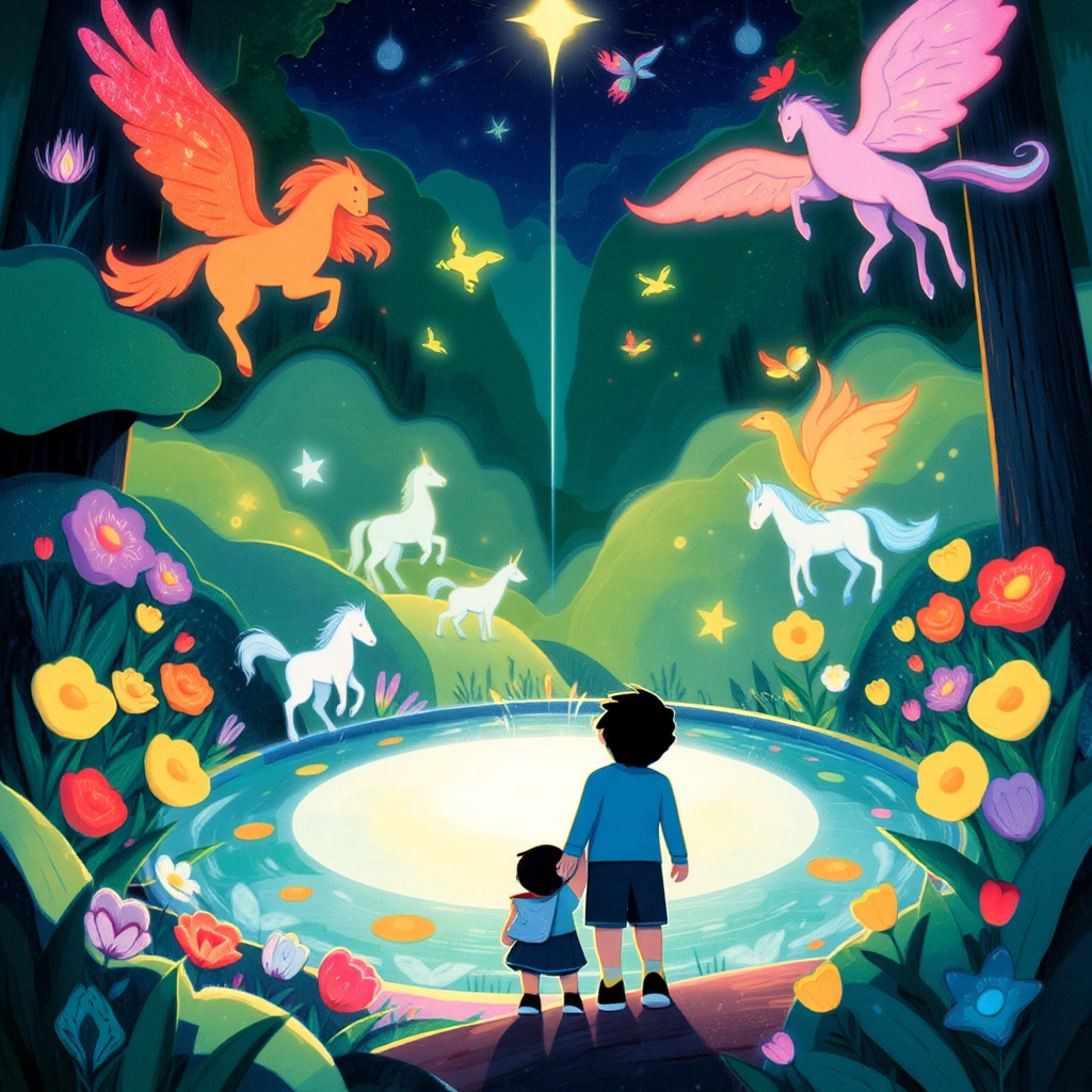 Past the gates, they discovered a beautiful hidden glade with a magical Spring of Harmony—a glowing pool surrounded by vibrant flowers and creatures. The map had led them to the legendary spring of their ancestors!