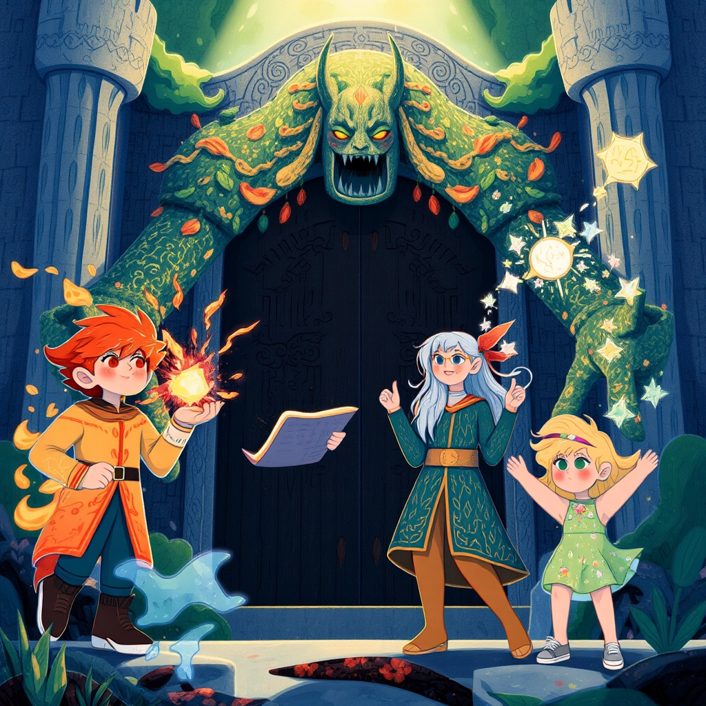 Finally, they reached a grand stone gate, guarded by a towering Golem. The siblings used their unique strengths: [Elias](FR25229Q) faced the Golem with flaming courage, [Mira](V9P7PPTS) cleverly deciphered the stone's riddle, and [Lyra](N5SHQQTR) calmed the guardian’s heart with her fairy dust.