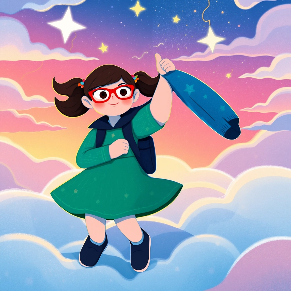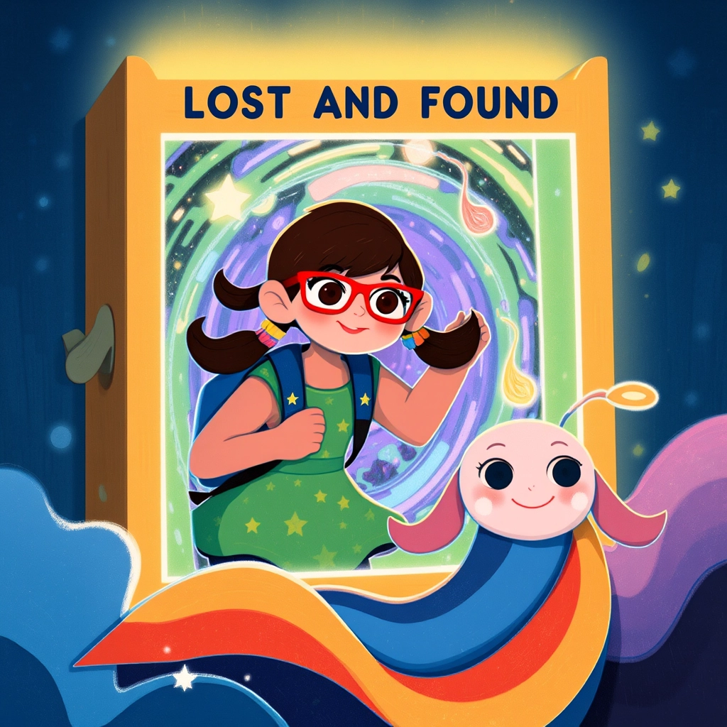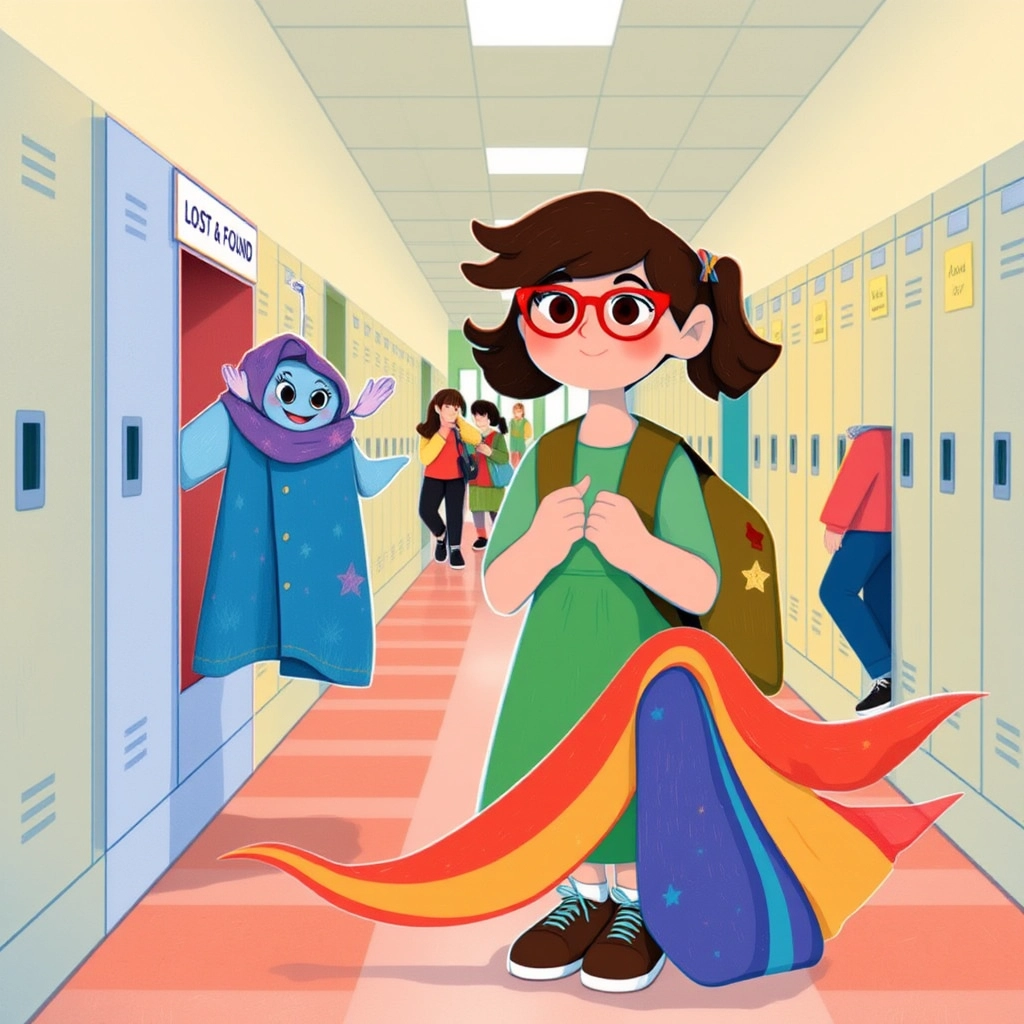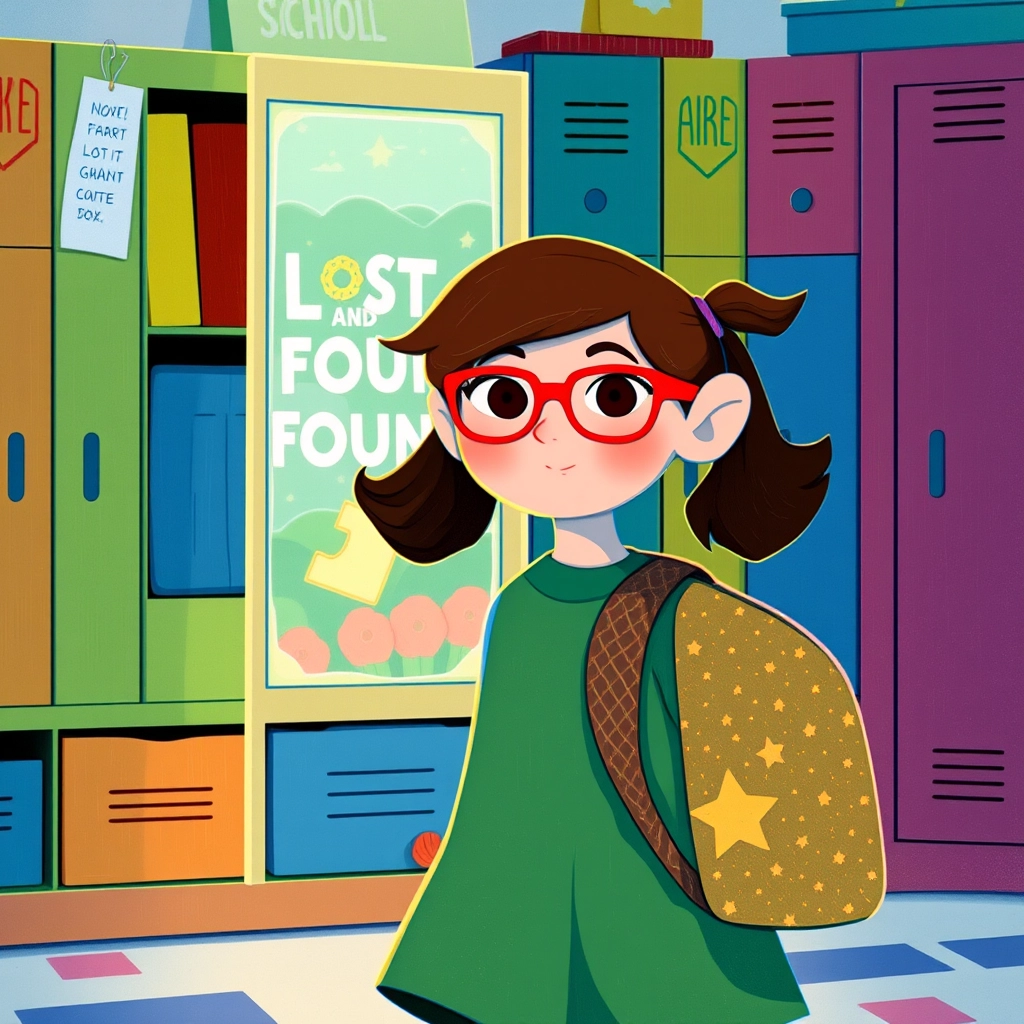 That day, [Mia](X5ZFM2KF), a curious first-grader with bright red glasses and a backpack covered in star stickers, was on a mission. Her favorite blue jacket was lost! She approached the Lost and Found box nervously.