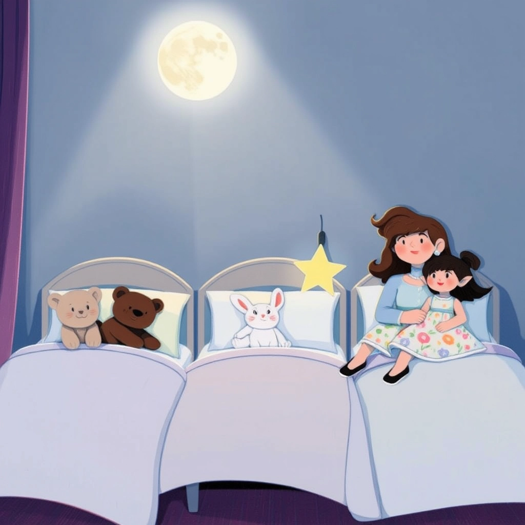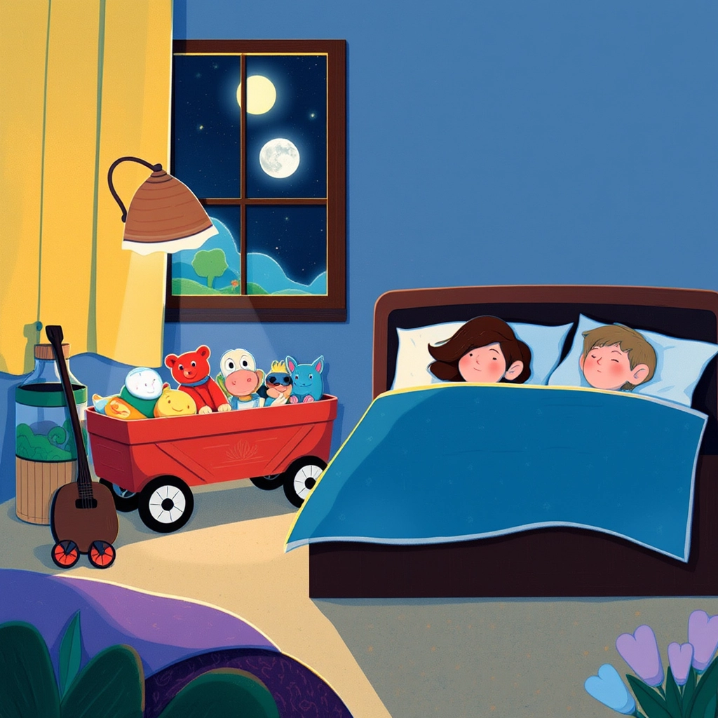 That night, the sisters cuddled into their beds, falling asleep as soon as their heads hit the pillow, while their favorite stuffed friends stayed in the red wagon for the night, watching over them.