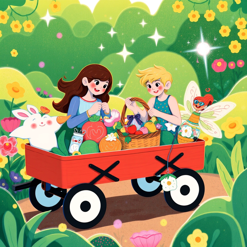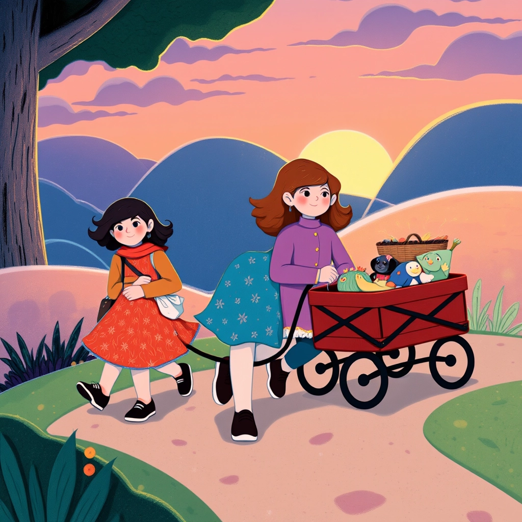 When it was time to go, the sisters carefully loaded their toys and picnic supplies back into the red wagon and headed home, their hearts full from a day of fun.