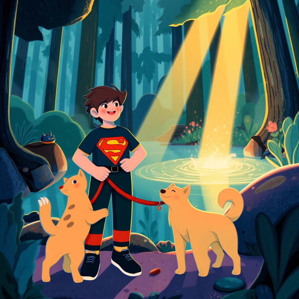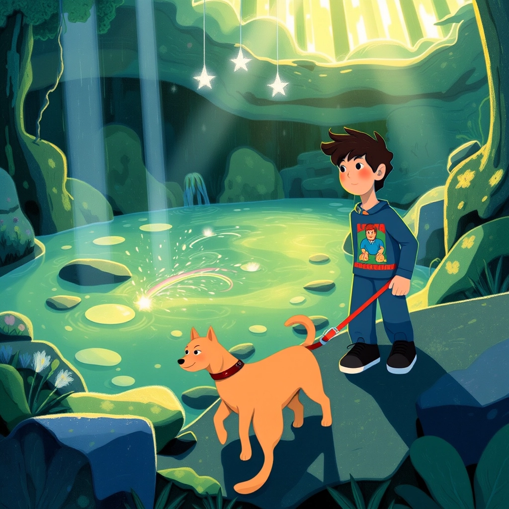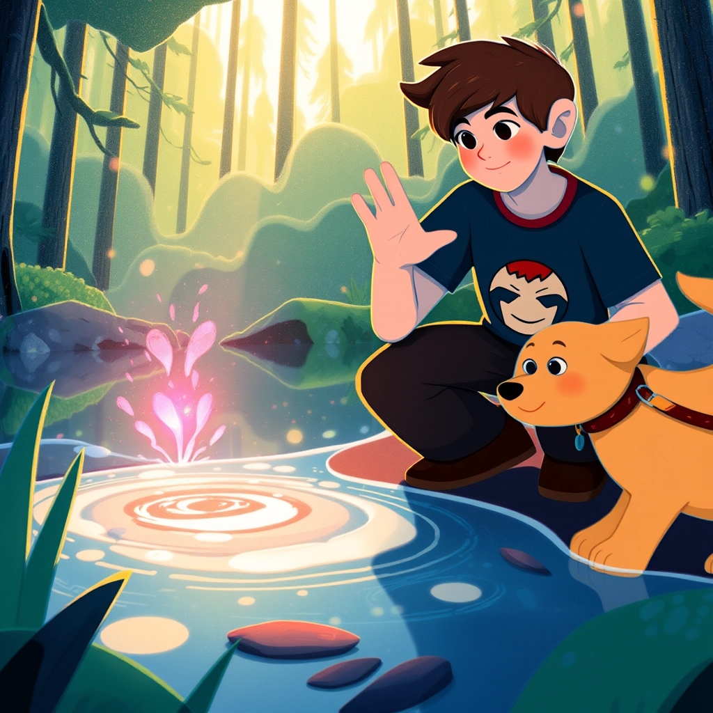 Curious, [Luke](2WZ6KD3P) followed [Mo](MP27J7H4) through the trees until they came upon a sight that took his breath away—a glimmering pond unlike anything he had ever seen. The water sparkled with colors like rainbows, and strange, soft light seemed to float above it.