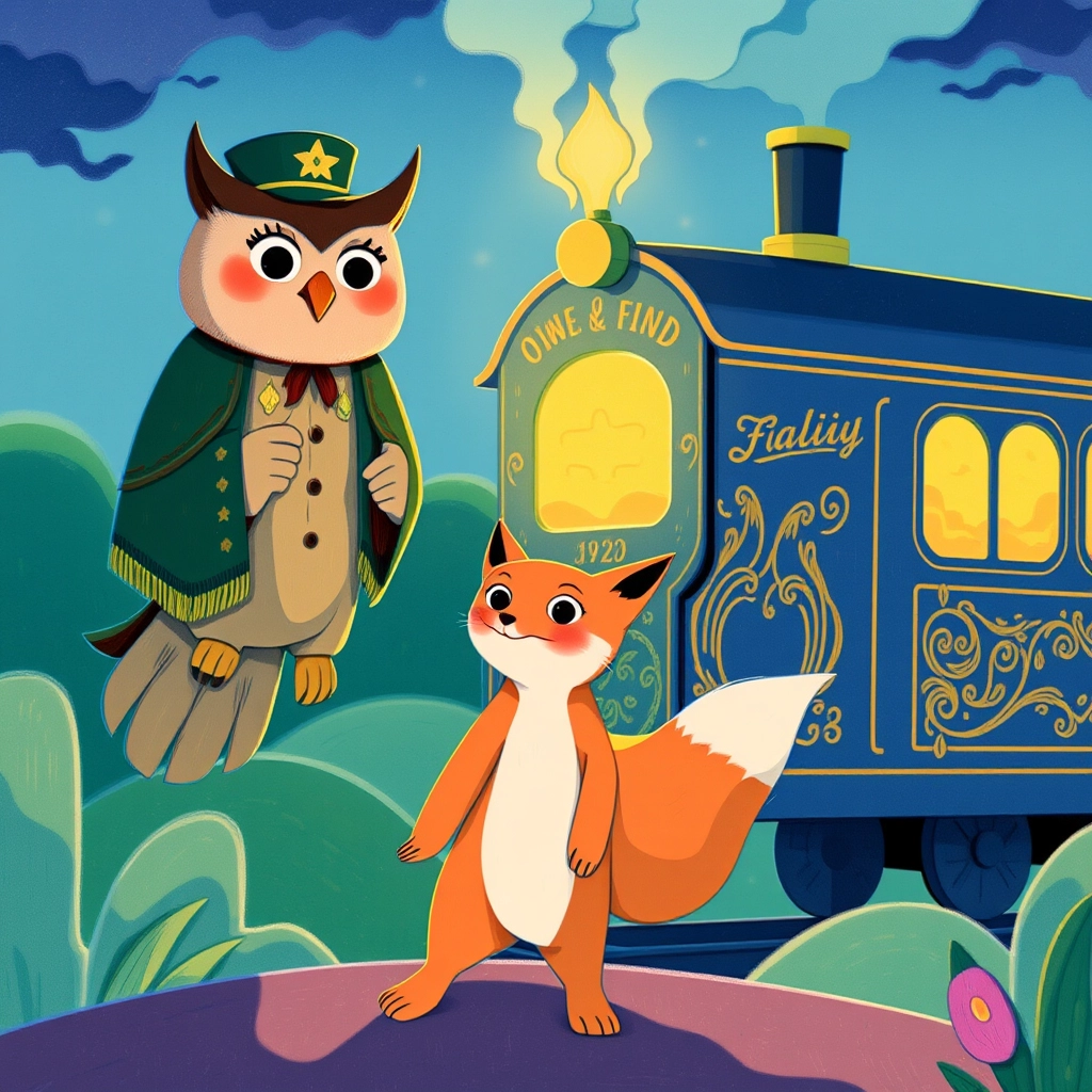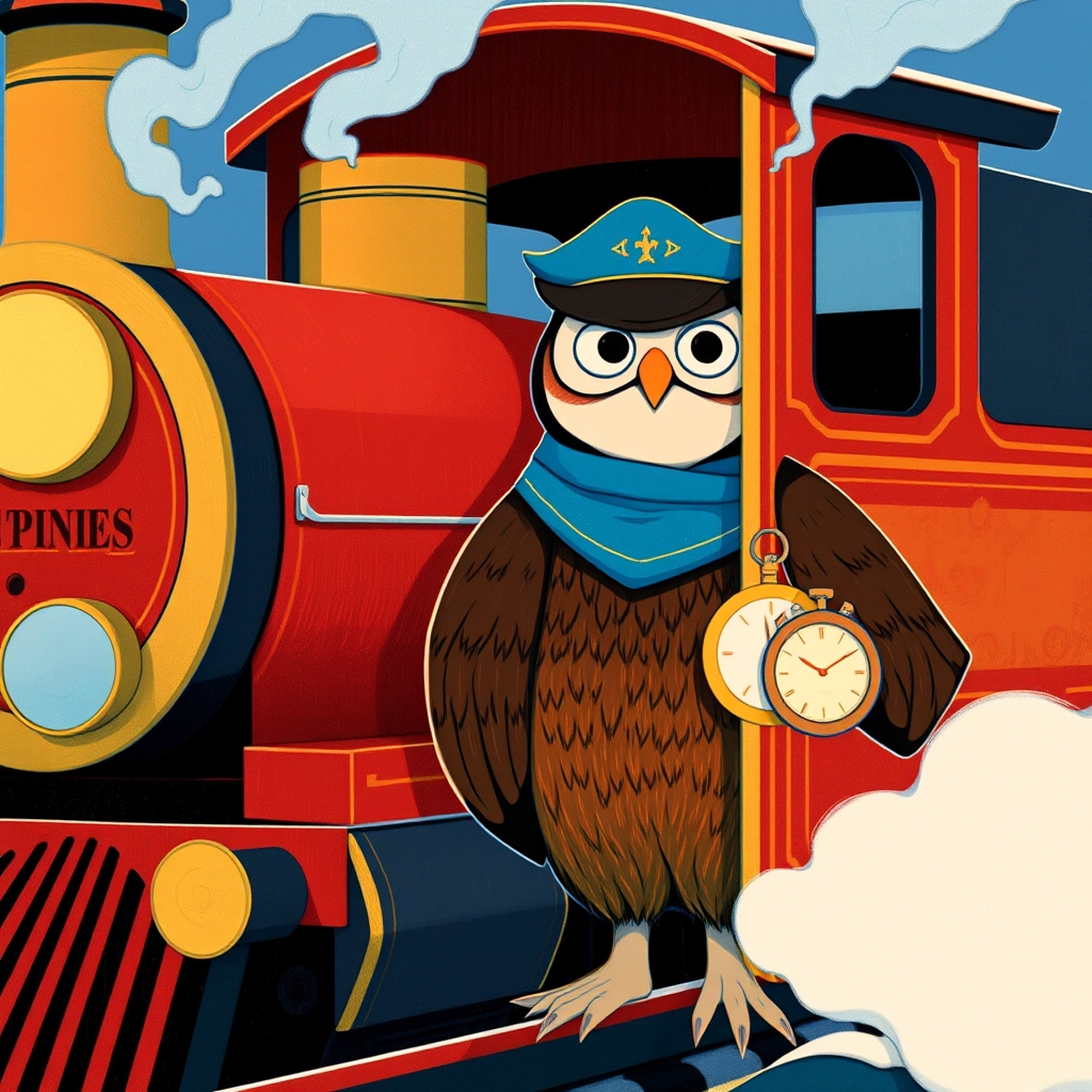 Suddenly, the train, painted bright red and gold, arrived and opened its doors. Out stepped the train conductor, a wise-looking owl wearing a blue cap and a pocket watch pinned to his feathers.