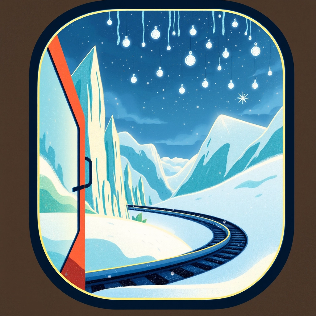 As the train chugged along, the forest outside turned into crystal landscapes with shimmering glaciers and sparkling snowflakes.
