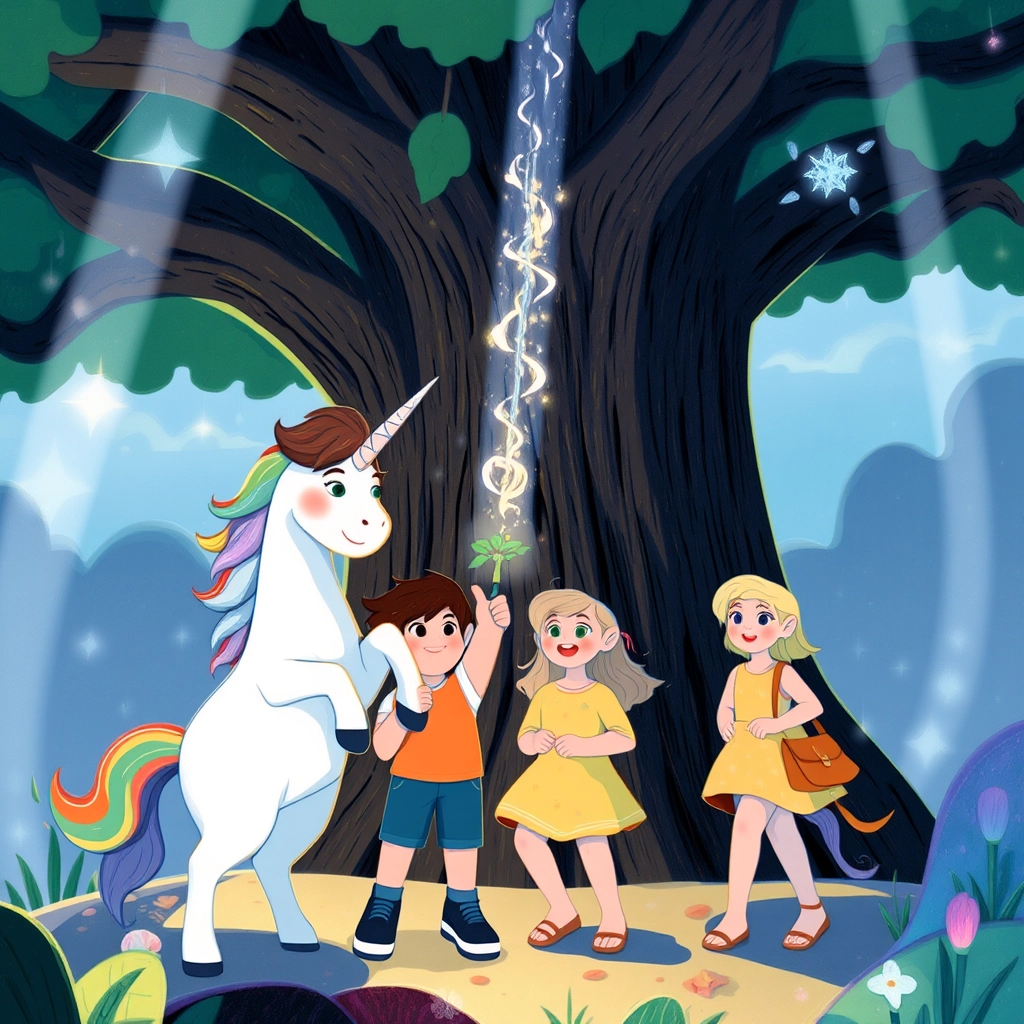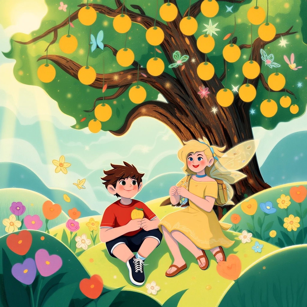 In the Magical Meadow, a towering tree gave them ripe, glowing fruit that tasted like happiness. 'Learning to share nature’s gifts is the key to a kind world,' said the tree in a soft, wise voice.