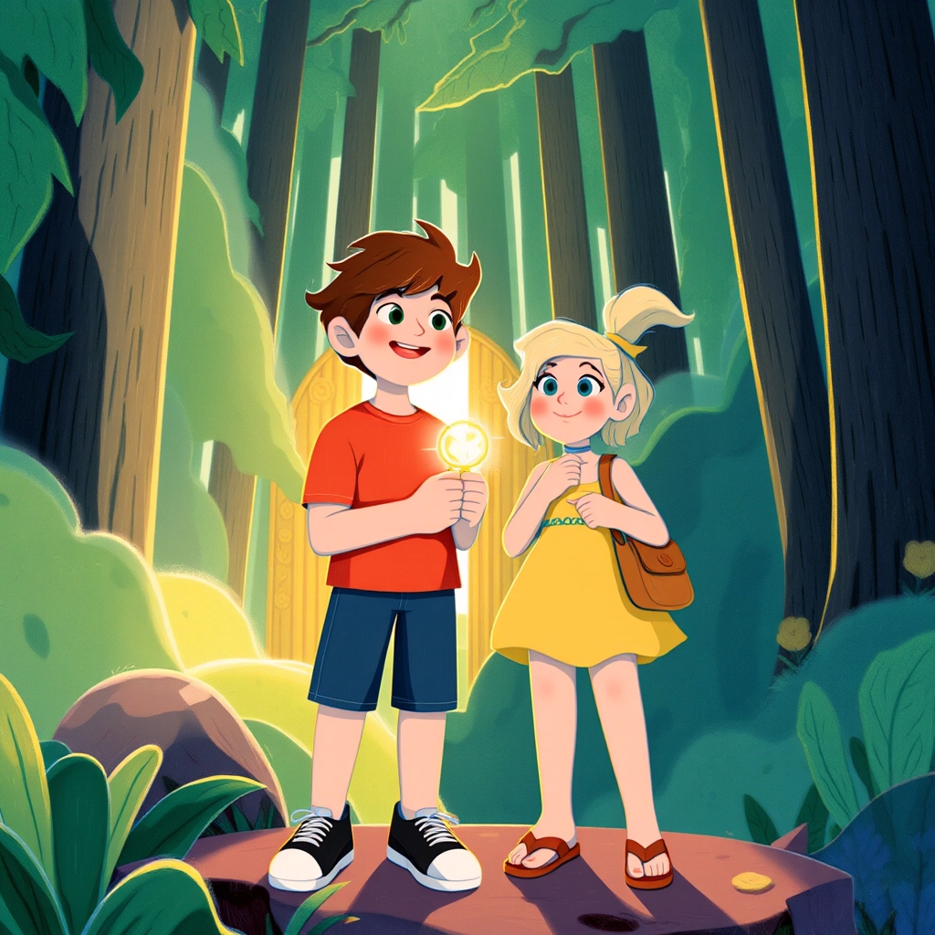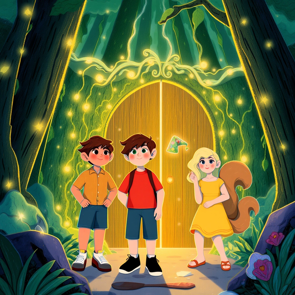 One sunny morning, [Ben](TW5Z2WK4) and [Emory](BQTW9327) set off on an adventure. As they wandered through the woods near their home, they stumbled upon a shimmering golden gate hidden by vines. A wooden sign read: 'Welcome to the Magical Zoo!'