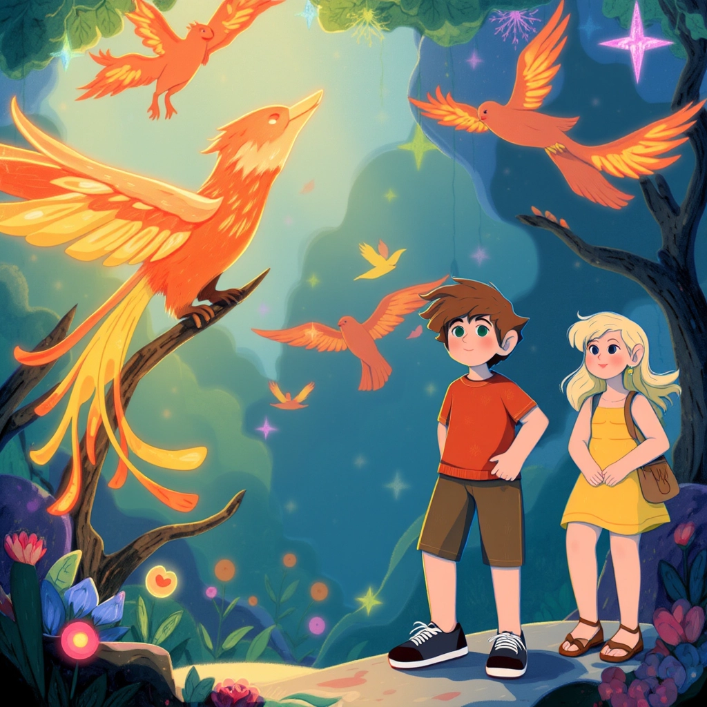 Their first stop was the Enchanted Aviary, where phoenixes with fiery feathers flew gracefully. One phoenix perched near them and sang a magical tune that told a story about protecting forests and keeping the skies clean.