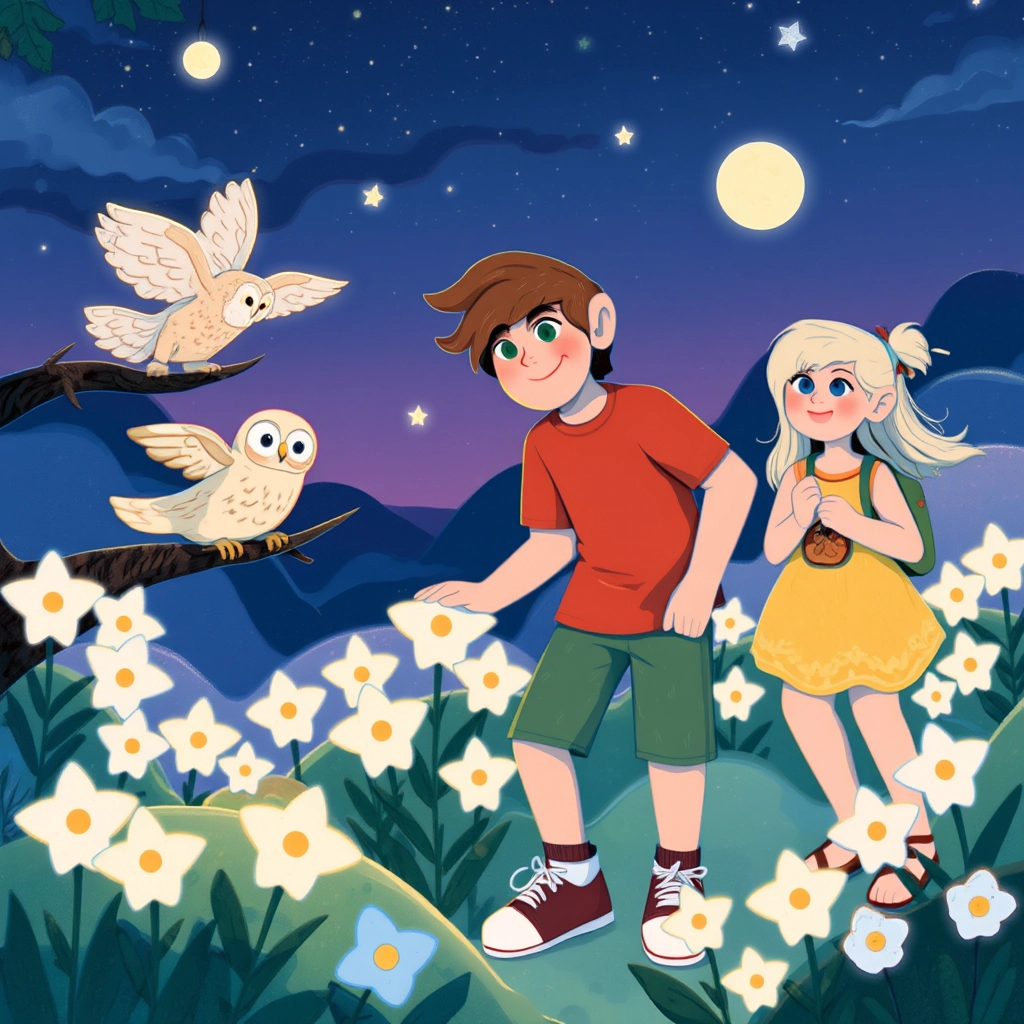 Later, they visited the Celestial Gardens, where glowing moonflowers bloomed. A wise owl with shimmering starry feathers told them, 'The smallest acts of kindness can light up the darkest nights.'